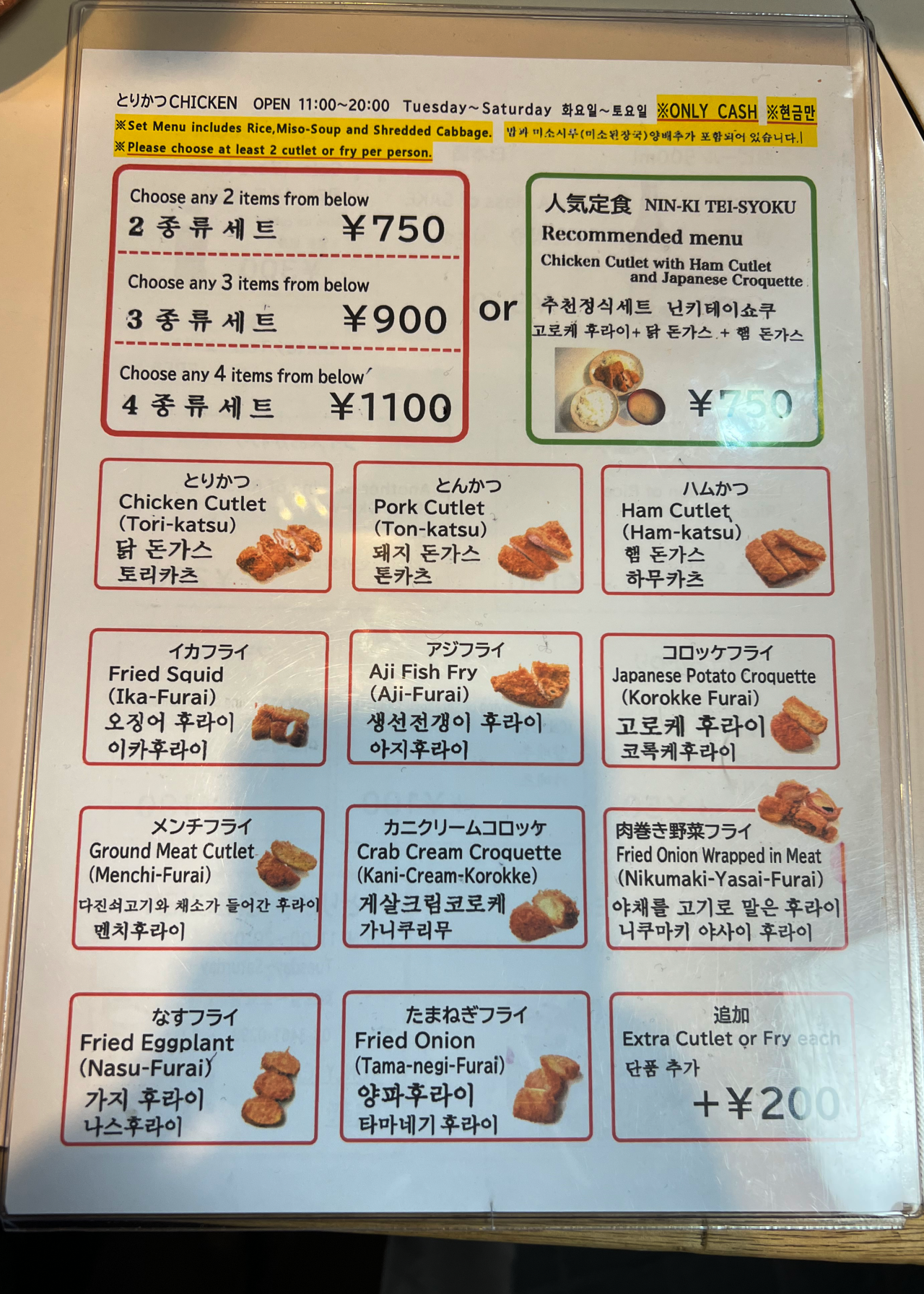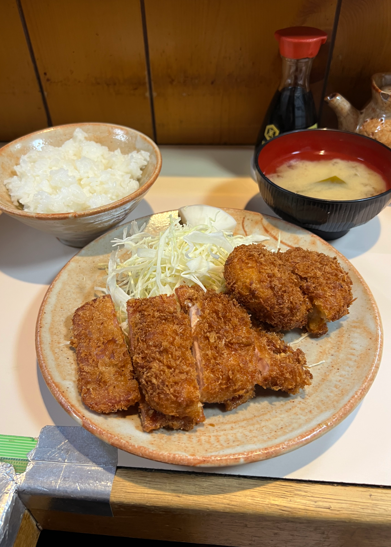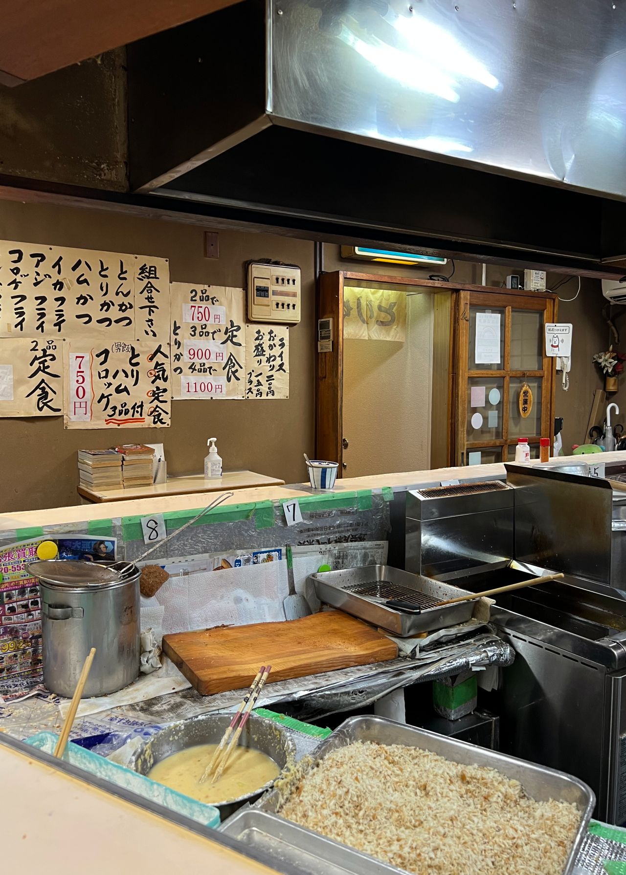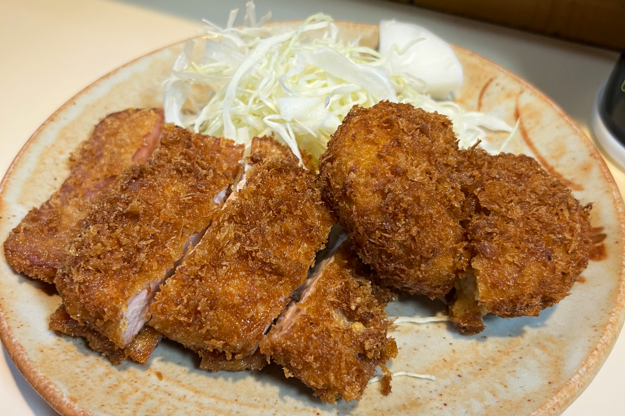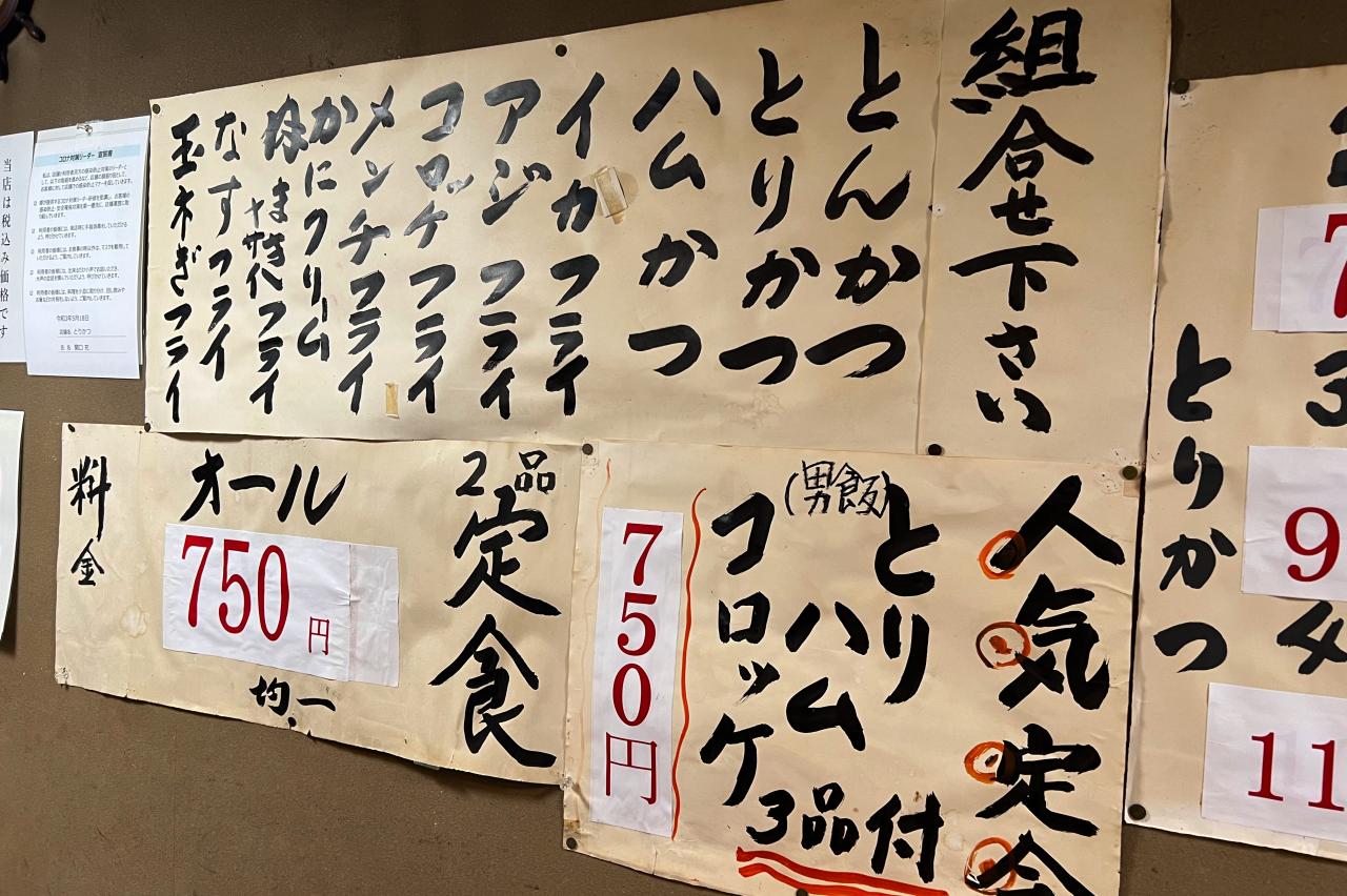 壁をじっくり見ながら今日のメニューを決めましょう。野菜や魚のフライの組み合わせ定食を頼むのもいいなぁと考えていたのですが、今回は王道の「人気定食(とりかつ・ハムかつ・コロッケ)」をセレクト。男飯とキャッチが入っていることもあり、ボリューム満点です!注文が入ってから揚げるので、出来立てアツアツ。とりかつからあふれる肉汁、タネがぎっしり詰まっているコロッケなど、写真を撮りながら思わずつばを飲み込んでしまうビジュアルです。料理に近づいて写真を撮ると、良い匂いがより嗅覚を刺激するので「早く食べたい…!」という欲が掻き立てられます。ひと口いただくと、パン粉はサクサク、中はふんわりジューシー。撮影で少し時間を空けてしまったのに、柔らかさが保たれていてびっくり。こんな経験あるかな?と記憶を辿りましたが…思い出せません。ご主人に何か工夫していることを伺ってみると、「秘訣は特にない」とのこと。「こういうことしているって何かあればいいんだけどね~」とチャーミングなお返事までいただきましたが、揚げている眼差しを見ていると、月並みですがその秘密は「ご主人の愛情」がぎゅっと詰まっていること、ではないでしょうか。創業以来変わらない調理法で提供されるメニューは、味も食感もまるっと「美味しい」。なんて幸せだろうと思いながら、一口ずつ嚙み締めます。