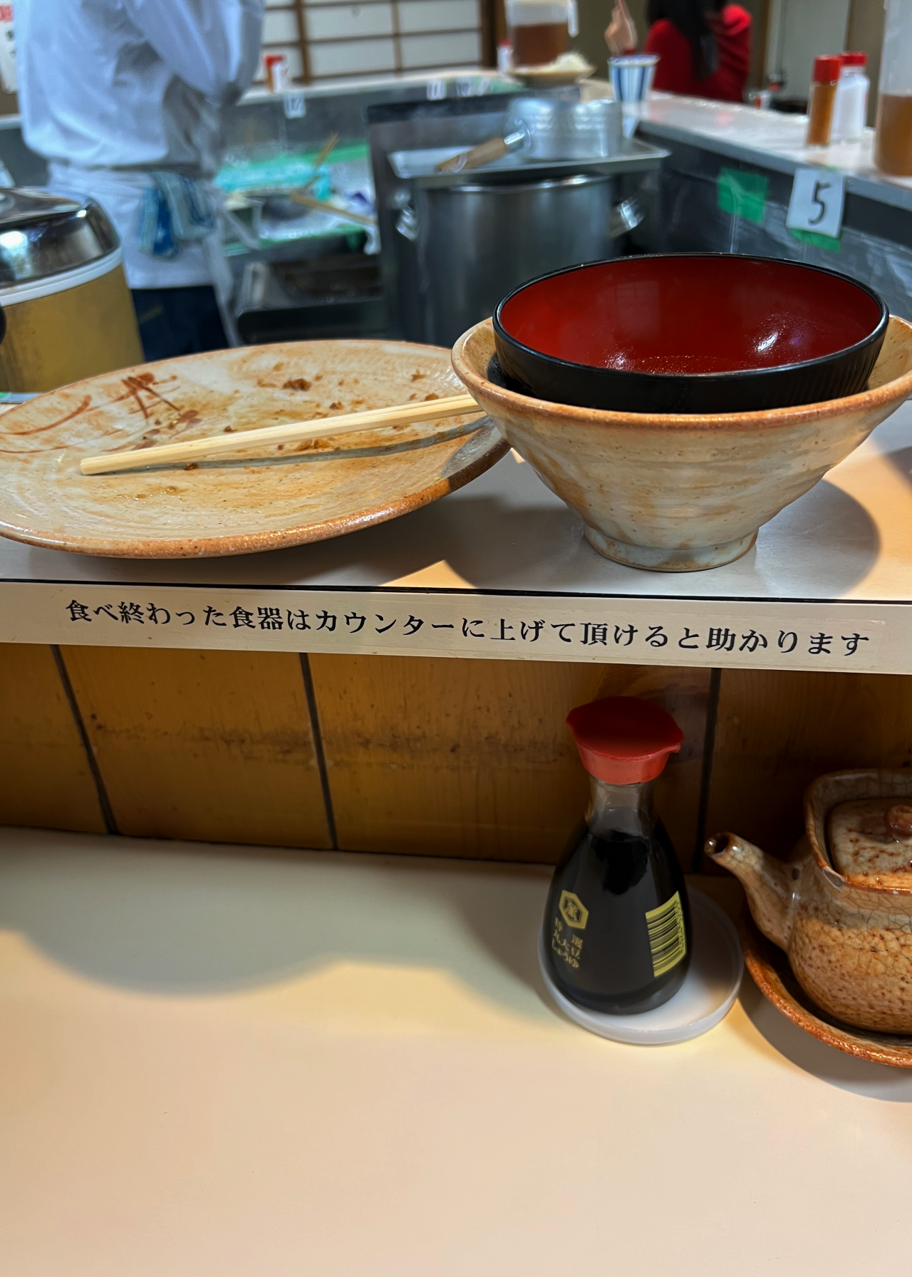 実は食事の間、老若男女、国籍を問わず多くの方が入れ替わりで来店していました。入店するや否や「人気」と一言だけ伝える常連さん、ご飯の量をご主人と確認し合っていた学生さん…アットホームな雰囲気に感化されたのか、私も隣に座った外国の方に「ソースはここ」「これは漬物だよ」など、ジェスチャーと片言の英単語で伝えると、ニコニコと頷いてくれました。店員さんに対して何度も「美味しい」を英語・日本語で伝えている姿に思わずほっこり。笑顔が見合わせられるカウンターの心地良さを感じながら、美味しい思い出や楽しい会話をお土産として持ち帰ることができる喜びを見つけました。ご主人に話を伺ってみると、昔は来店の8~9割が地元の方だったそうですが、今は観光客や外国の方の来店も増えてきたとのこと。入り組んだ場所にあるお店を良く見つけるなぁ…と思っていると、Yelpという海外版の食べログようなサイトや羽田空港のフリーペーパーにも載っていると教えていただきました。日本滞在中に複数回足を運ぶ方や、来日の度に来店される方など、海外のリピーターのお客様もいるそうです。「美味しいご飯は人を繋ぐ!」を改めて実感しました。