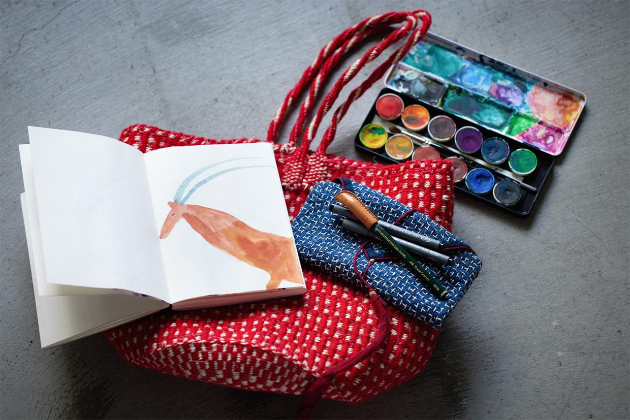 大きな赤いカゴバックには画材やお茶の道具も入れて、小さな黒いポーチはポケット代わり。