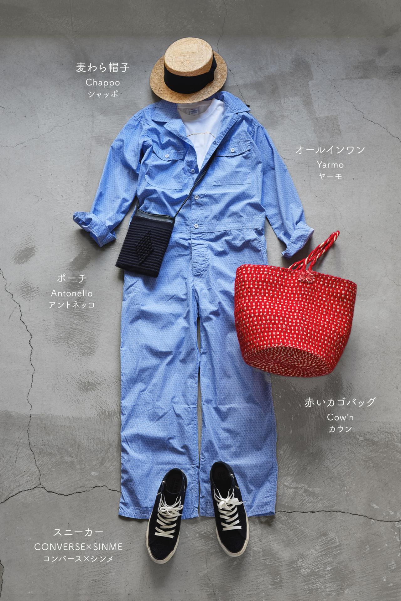 草の上でゆったりのんびり過ごせるよう、楽チンなオールインワンで。足元はいっぱい歩いても大丈夫なようにスニーカーを。
