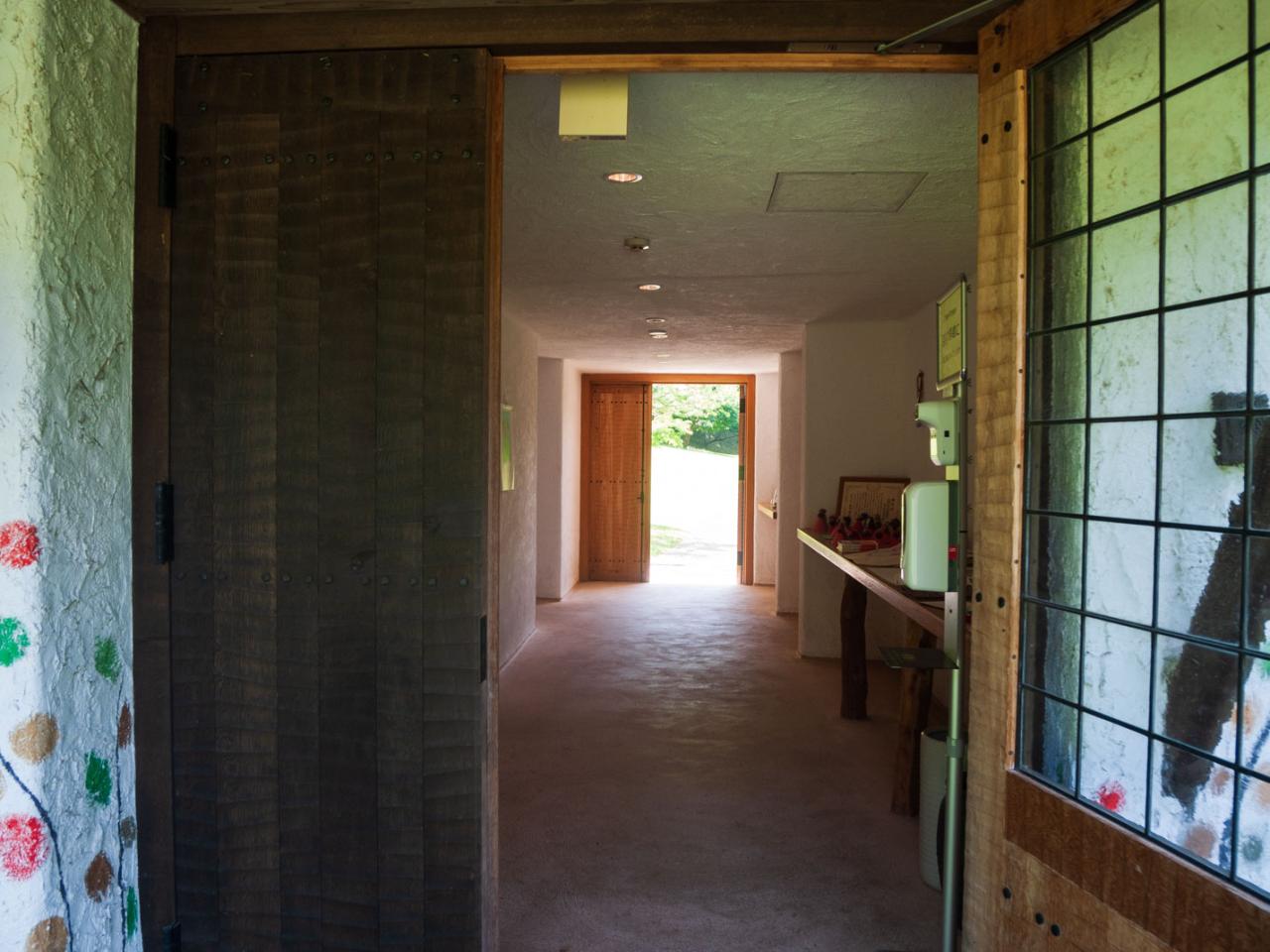 丘の中腹に潜っていくような美術館の入り口。壁面の絵は村の子どもたちと一緒に描いたそう。