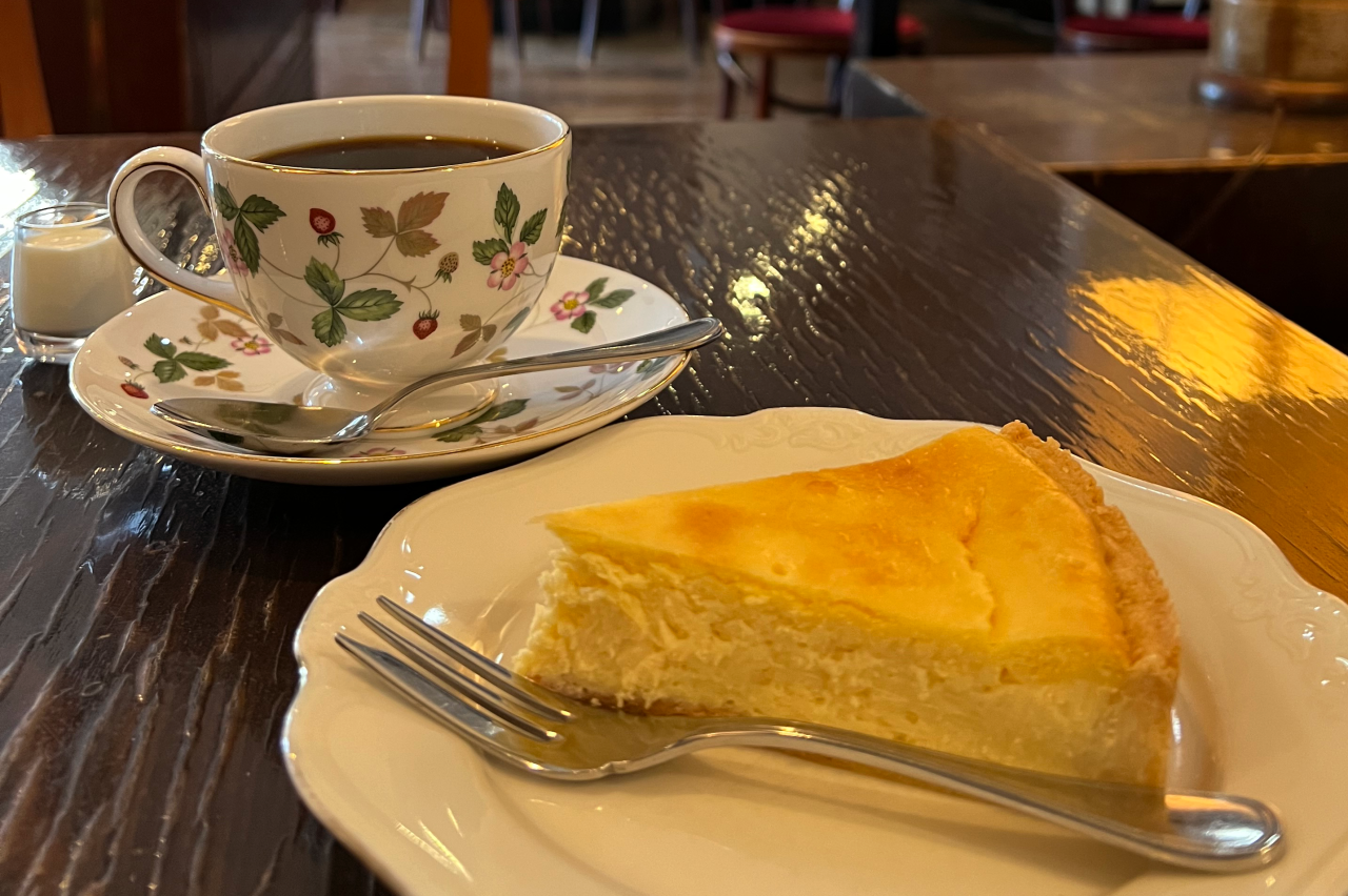 コーヒーはマスターの後藤さんのハンドドリップ。濃い味わいに、落ち着くアロマを感じます。続いてお店自慢のチーズケーキ。ひとくちいただけば、なんとも素朴な味わい。生地部分は粉のおいしさがしっかりと感じられ、チーズ部分は意外にも酸味がしっかりと効いているのがポイント。そのためか、くどくなくさっぱりといただけます。ブルーベリーのクランブルチーズケーキは、ほろサクなクランブル生地が少し甘く、チーズ部分はよりミルキー、そして中に入ったブルーベリーがとてもみずみずしくて滑らかな感じ。食べ比べると、同じチーズケーキでもそれぞれに味や配合を変えているのがよくわかります。