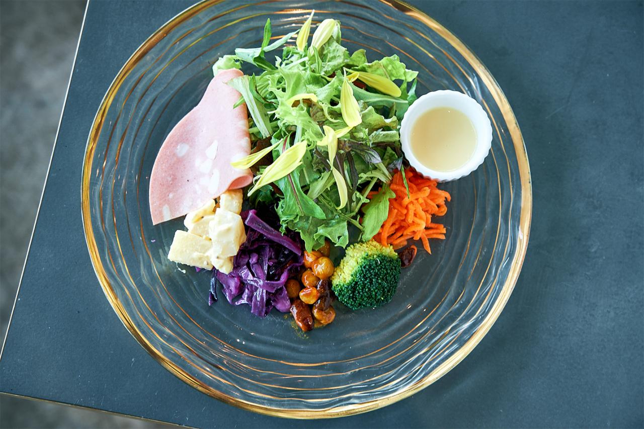 日中は、フルハイトの窓から太陽の光が気持ちよく入ってくる。ここでは、ぜひゆったりとランチコースを。スタートは、とうもろこしのポタージュ、キャロットラペ、レッドキャベツのマリネ、キャラメリゼしたナッツ、プロシュットなど、目に鮮やかな前菜8種が盛り付けられたプレートから。シャキッと新鮮な野菜は地元産を中心に扱い、レストランの運営会社がある広島の食材も使われることが多いらしい。スパイスやハーブの効いた品々は、よく冷えたビールや白ワインにも合いそうだ。