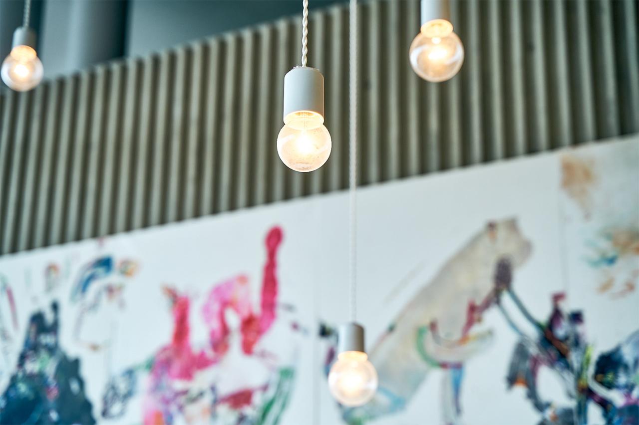 入口と店内のアートは、愛知県立美術大学出身の松村かおりさんによるもの。