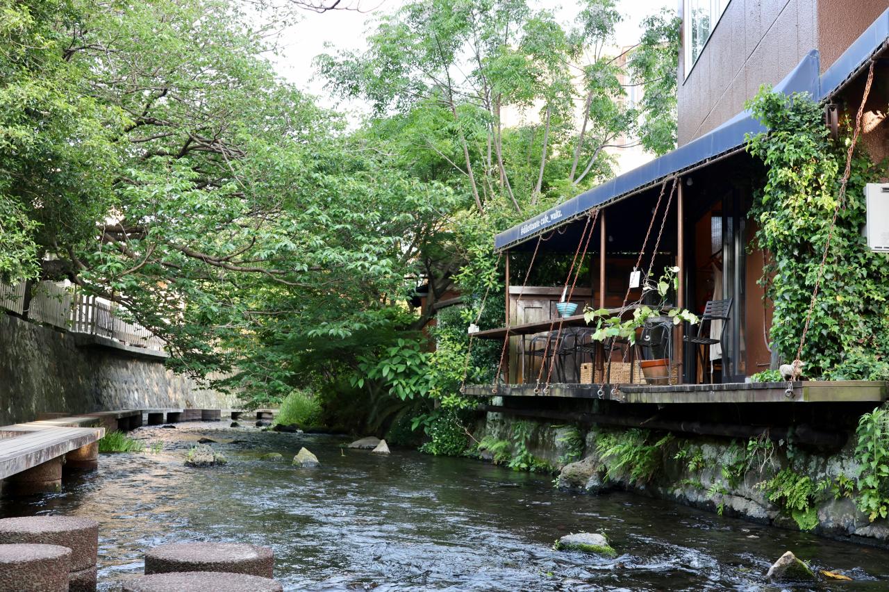 市内を流れる源兵衛川の中には飛び石や木道が設置してあり、三島駅周辺の散策ルートとしてとても人気です。そんな水辺の散歩道の途中に、青い屋根と素敵なテラス席のある〈#dilettante cafe(ディレッタントカフェ)〉があります。