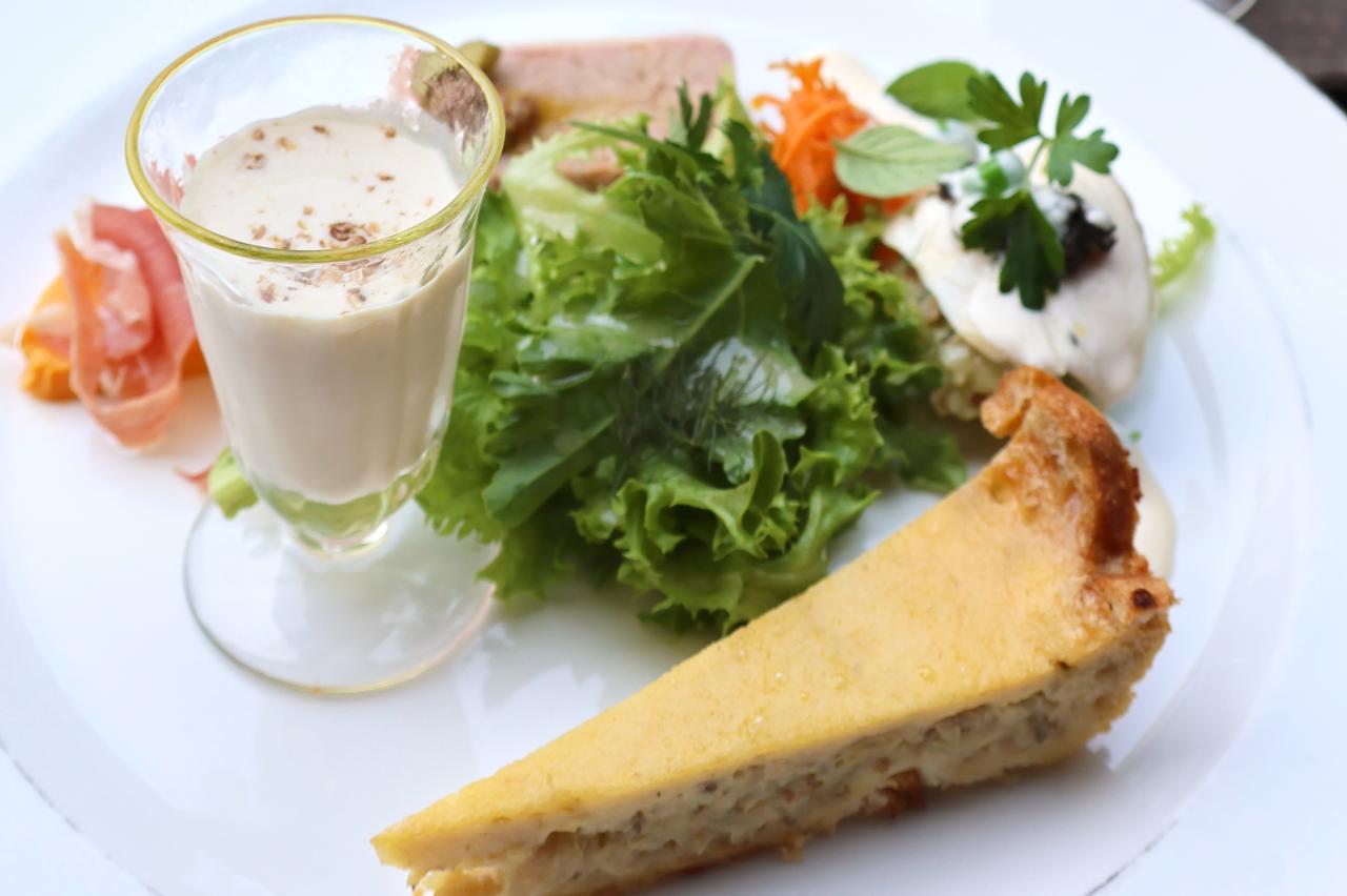 彩り豊かな前菜はお肉、魚、野菜の盛り合わせで、異なる美味しさを少しずつ味わうことができます。中でもキッシュが絶品。外側のパン生地のカリッと感とクリーミーでふわふわの具が他にはない一品で、ぜひ一度味わっていただきたいです。この日のパスタは、新玉ねぎときのこのクリームパスタ。濃厚なクリームソースと玉ねぎの甘みが絶妙です。追加で注文したこちらのパスタは2人でシェアをおすすめしてもらったため、ちょうどよい量でした。