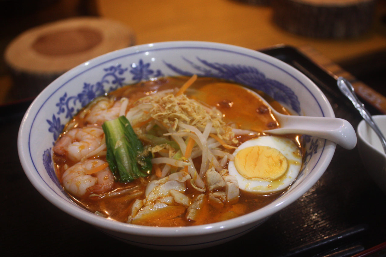 このお店の人気NO.1料理は、「ホッケンミー」。マレーシアの麺料理として有名ですが地方によって味付けや具に違いがあり、ペナン島のホッケンミーは海老風味豊かな出汁をベースにした、うまみと塩味の効いたエスニックなスープが決めてのあたたかい麺料理です。また麺にも特徴があります。日本では、ひとつの麺料理に1種類の麺のみを使うことがほとんどだと思いますが、ここでは、通常のイエローミー(卵麺)に+50円でビーフン(米麺)を追加し2種類の麺を味わうことができます。弾力のあるイエローミーの食感と、ツルツルッとしたビーフンの喉越しの両方を味わうことができ、これがハマります!