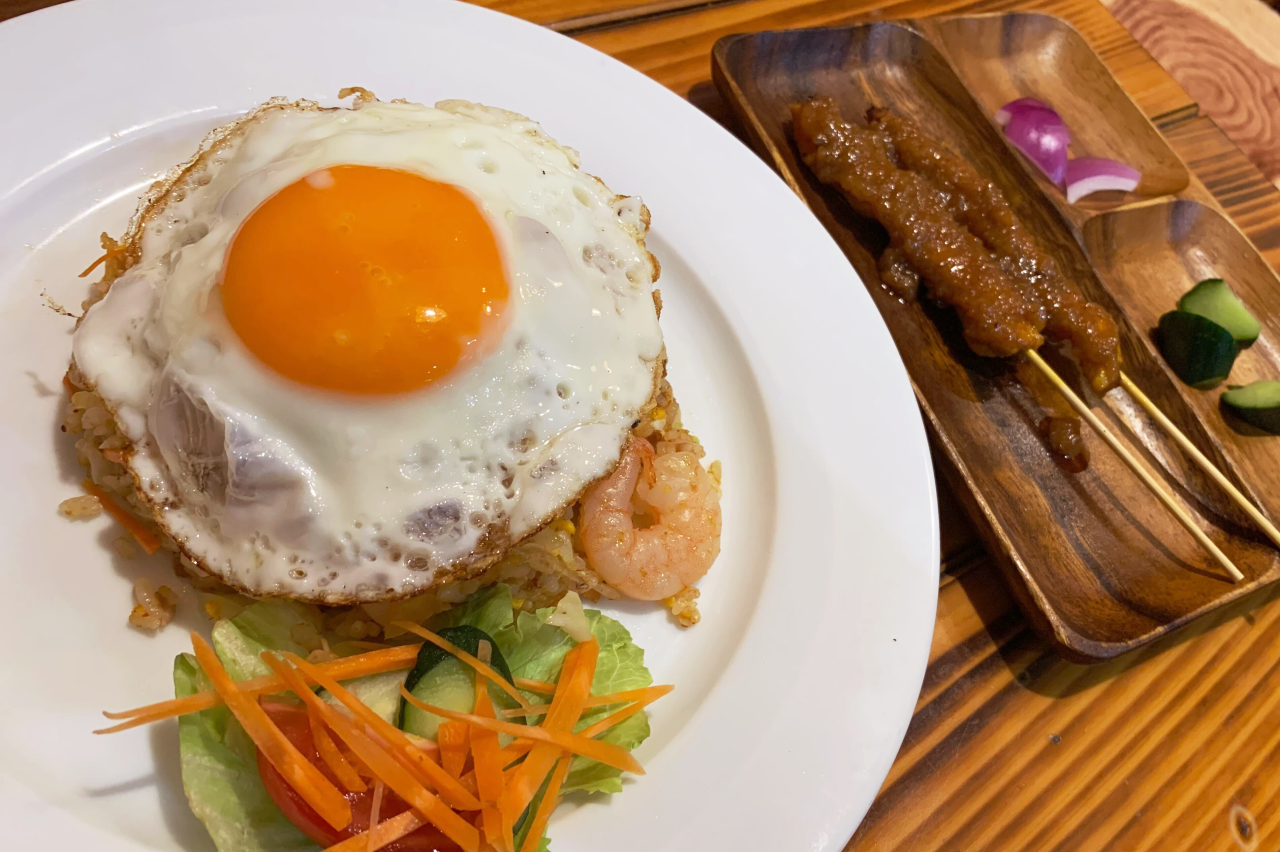 マレーシア風チャーハンの「ナシゴレン」もおすすめ!スパイシーで香ばしいごはんと、半熟の目玉焼きを混ぜ合わせていただくと、絶妙な美味しさです。サイドメニューとして必ず頼みたいのが、鶏肉を串に刺して炭火で焼いたマレー風串焼き「サテー」。見かけは日本の焼き鳥に似ています。サテーの鶏肉は本場マレーシアでも一般的に小ぶりなものを使われますが、小ぶりなお肉にピーナッツの甘辛ソースがよく絡んで濃厚な味になっています。
