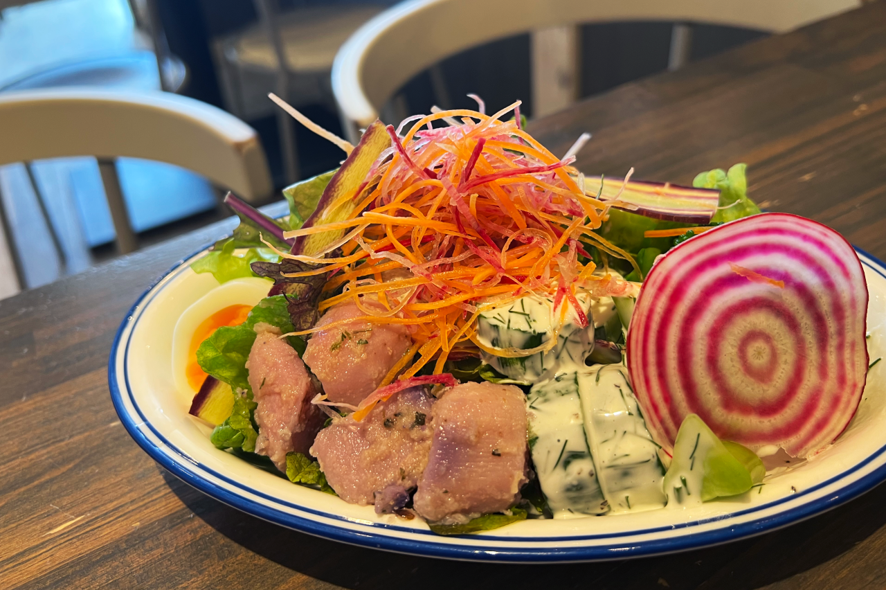 他のお店では聞いたことがない「豆乳塩ラーメン」や「青唐つけ麺」、「鎌倉サラダ」がパッと目に飛び込んできます。今回はこの3品をいただくことにしました。料理を待つ間、まずはルイボスティーで乾杯。ほんのり口の中に広がる苦みが心地良い!暑い中、鎌倉散策をした身体をクールダウンさせて、ラーメンをいただくための準備も万端です。ラーメンの前に絶対食べてほしいのが、畑で育った鎌倉野菜をたっぷりいただける「鎌倉サラダ」!季節ごとに野菜の種類が変わるとのことで、今日は紫色のじゃがいも“シャドークイーン”や、目にも鮮やかな“うずまきビーツ”、キュウリとディルを和えたものなど盛りだくさん。珍しい野菜も多いので、食感も味も新しい体験をすることができます。