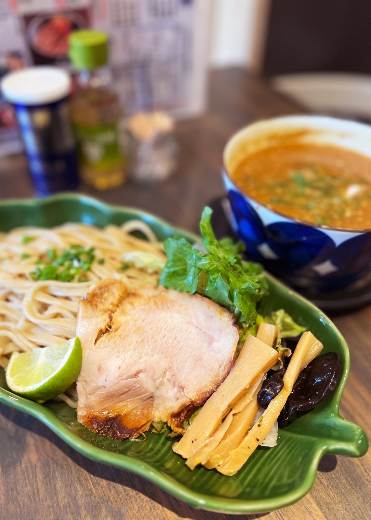 さて、たっぷり野菜をいただいた後には、いよいよラーメンへ!「青唐つけ麺」は麺に青唐辛子が練りこんであります。麺だけで食べてみると、ピリッとした風味が。魚介と豚骨をベースにした濃厚なつけ汁は麺との相性を考えて、まろやかさとさっぱりさが共存するよう計算されています。付け合わせの葉物野菜もつけ汁と一緒にいただくと、サラダとはまた違う野菜の甘みを感じることができますよ。チャーシューやメンマに加え、きくらげもトッピングされているので、食感を楽しみながら食事が進みます。