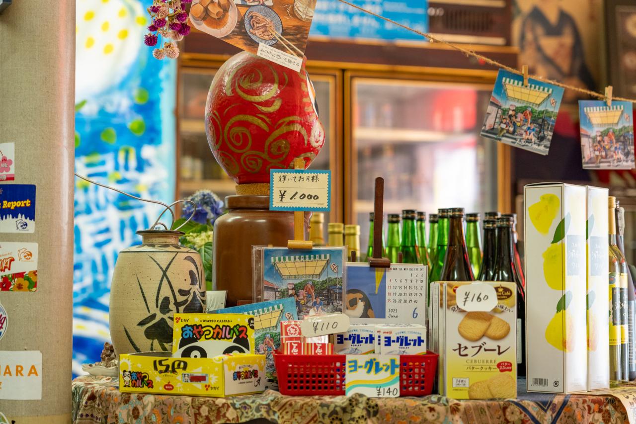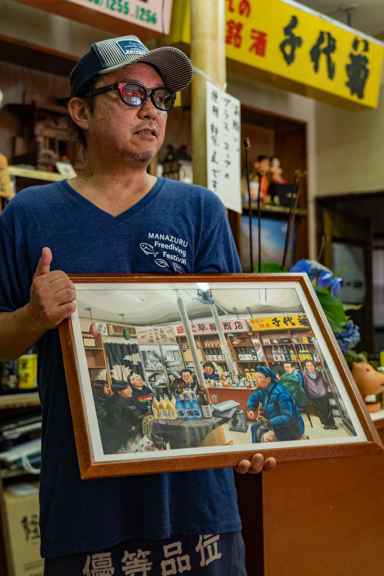 山田さんは元々野外芸術祭に参加するために真鶴に来たところ、すっかり真鶴の人や町に魅了されてしまって毎晩のように草柳商店で宴会を行っていたそうです。芸術祭が終わったら一度は横浜の自宅に戻ったのですが、再度真鶴にやってきて、その時に持ってきたのが「草柳商店の真鶴の絵」。その絵はTISというイラストレーションの大きなコンペティションで入選します。そのまま真鶴に移住して、そして結婚…さらにこの素晴らしいストーリーをしげさんは歌にして(「輝いてお月様」サナギメン)…と、盛りだくさんなのですが、コトの顛末はしげさんの噺家さんのような語りで実際に耳にするのをおすすめします!