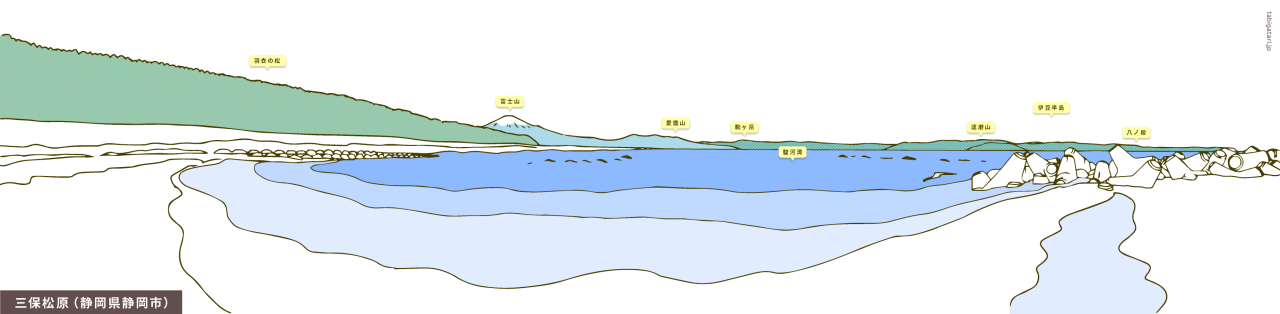 静岡県の三保半島にある景勝地。その美しさから日本新三景や日本三大松原のひとつにも選ばれ、歌川広重の浮世絵や数々の絵画・和歌に表現されています。また、2013年にはユネスコの世界文化遺産「富士山」の構成資産としても登録されました。