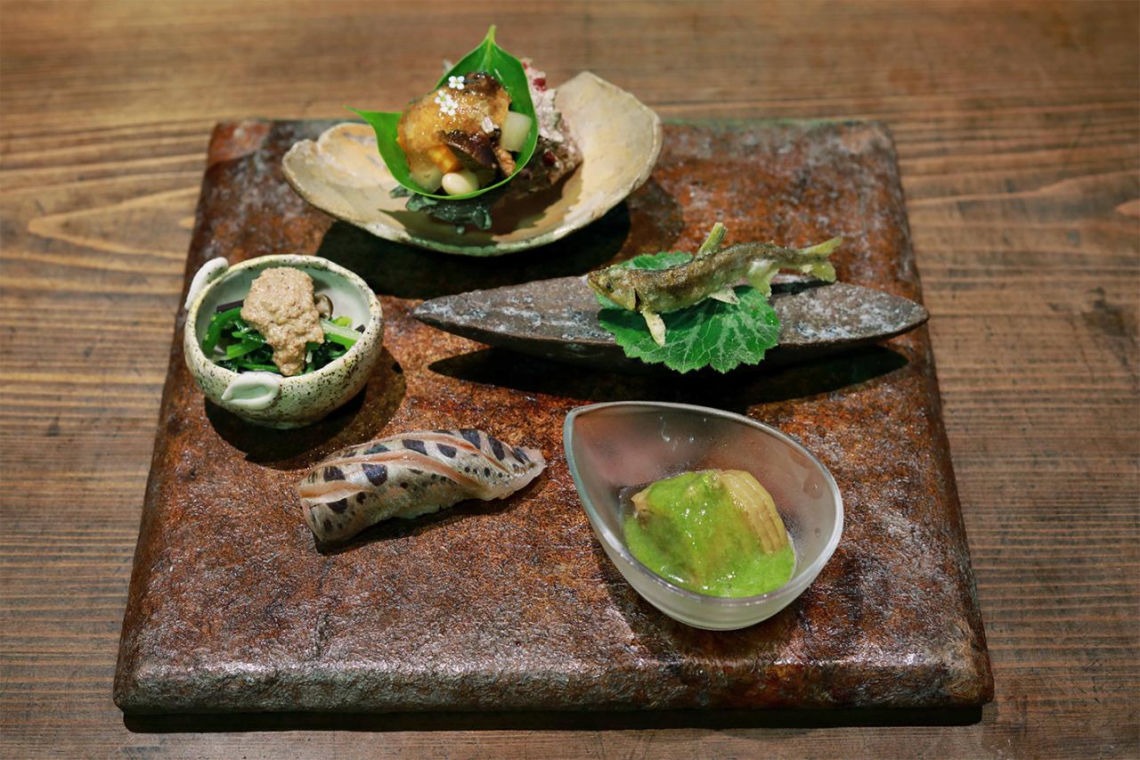 料理のメニューは「季節のおまかせ(9~10皿)」¥7,700(税込)のコース1種類のみ(内容は仕入れ状況や時期により異なる)。前菜は、鳥羽産サザエと美杉の山の幸の合わせ盛り・稚鮎の白扇揚げ・米ナスのオランダ煮・アマゴの握り・ほうれん草と水菜の胡麻よごしの5品。