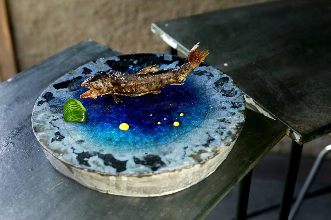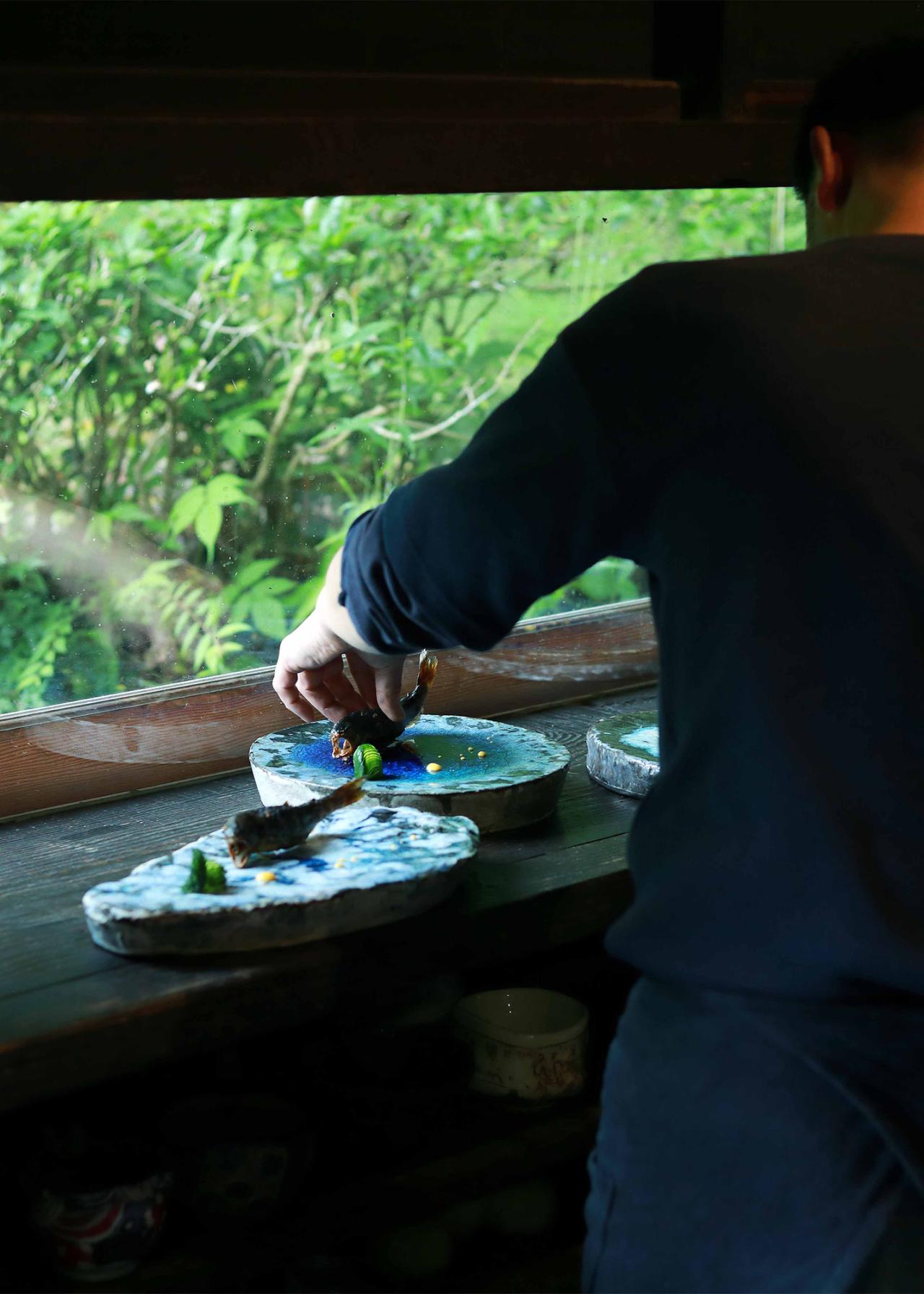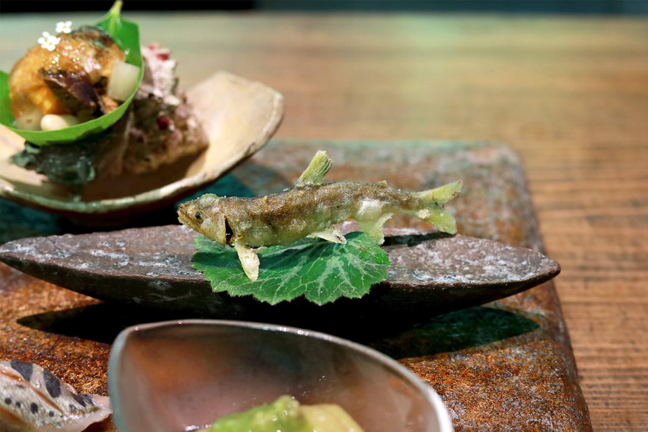 佐知子さんの故郷・三重県海山を流れる銚子川は日本でも有数の清流。その透き通るコバルトブルーを写した器に、炭火で1時間じっくり焼いた新鮮なアマゴが泳ぐ。頭から尻尾までガブッと、丸ごと。