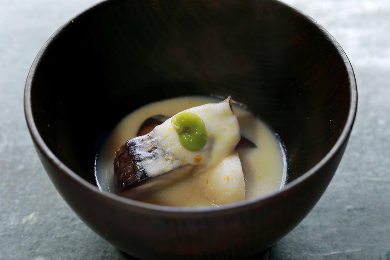 お椀は空豆のスリ流し。伊勢湾の鰆と原木椎茸、蕪、モッツァレラチーズ、米団子に、香り高いジャバラをぱらり。絶品。