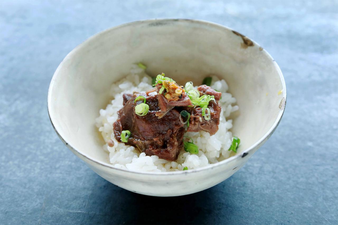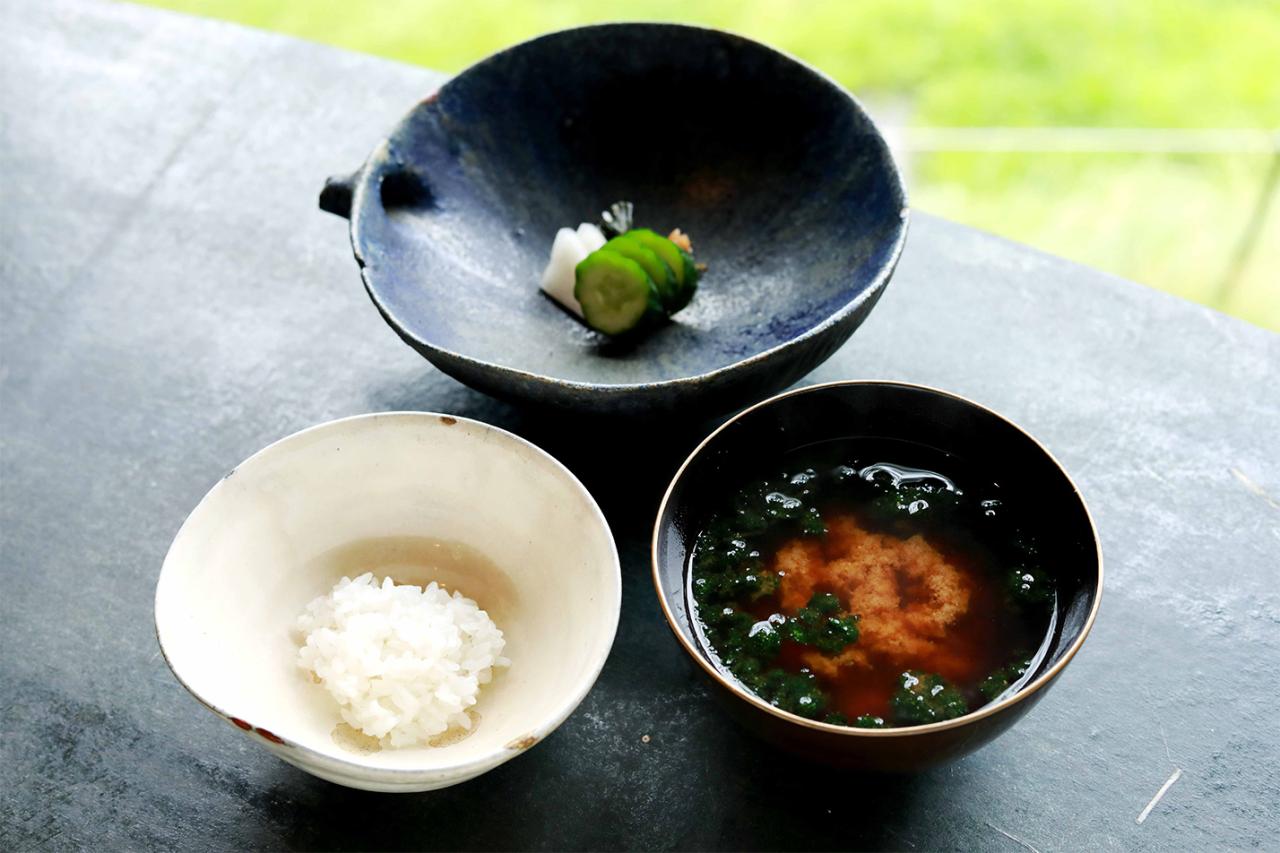 締めのお食事は、自家栽培の白米と赤だし、糠漬け。ご飯はまずはそのままでいただき、2杯目はお焦げ。さらに3杯目は鹿肉丼か、菜種油と塩をかけたもの、お醤油をひと垂らしして炙った香ばしいご飯から選べる。きれいな水と空気の中で自然農法で育ったお米を竃(かまど)炊き。美味しくないはずがない。