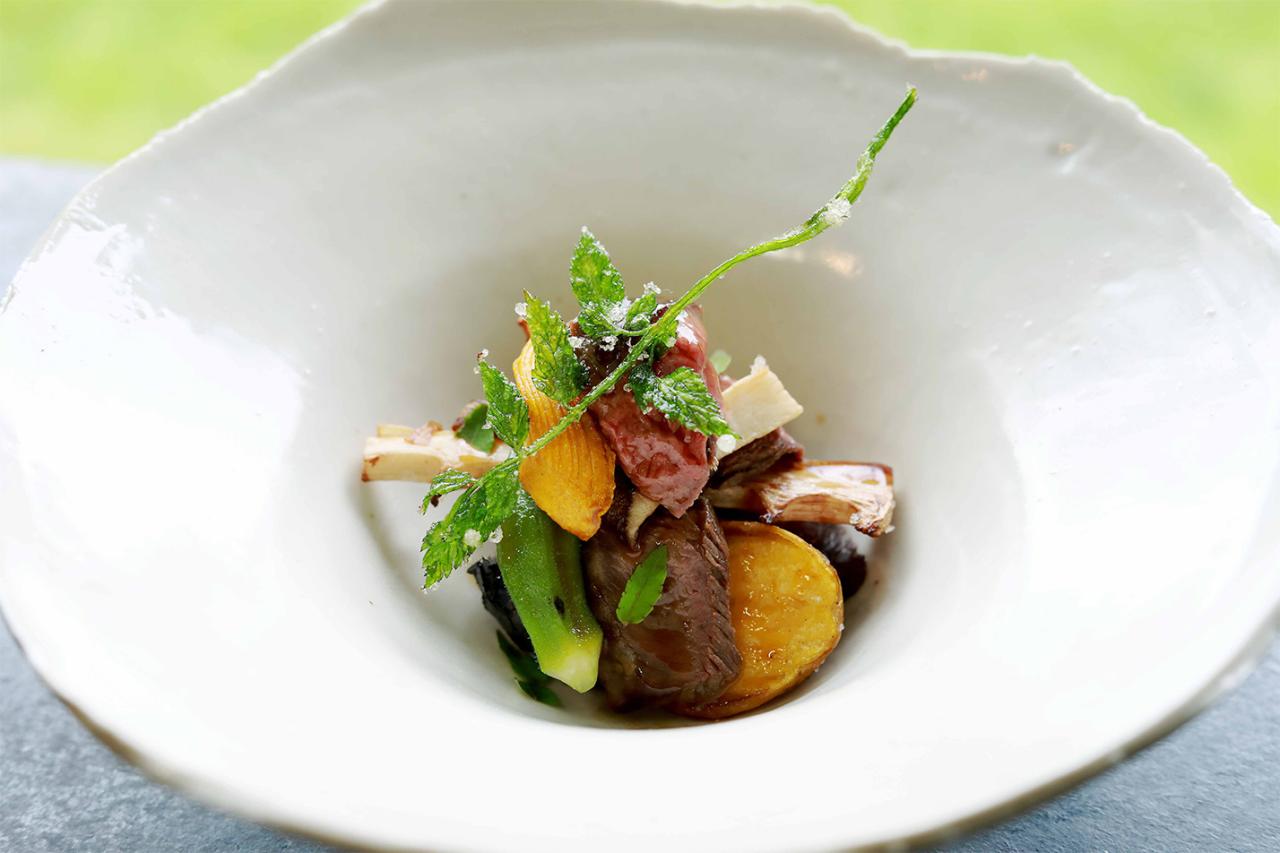 お肉は美杉在住の罠師・古田洋隆さんが仕留めた鹿肉のロースト、畑の野菜添え。「古田さんの鹿は間違いないです」(敬さん)。後ろ脚に罠が掛かると逃れようと暴れて肉に傷がつき、体温も上昇して味が落ちる。古田さんは、そうならないように罠を前脚で踏ませることが出来るというからすごい。