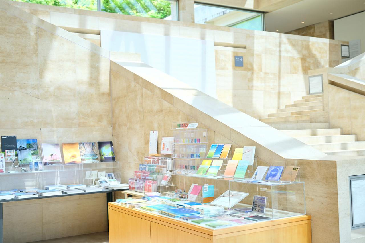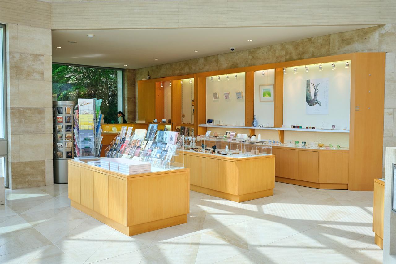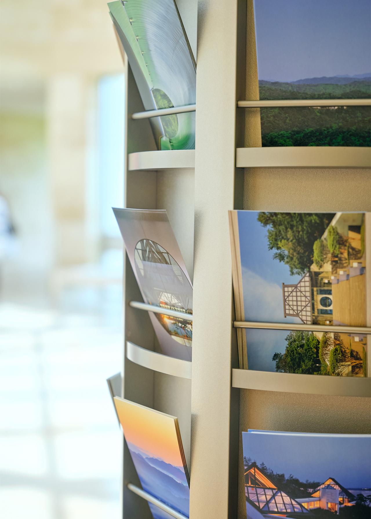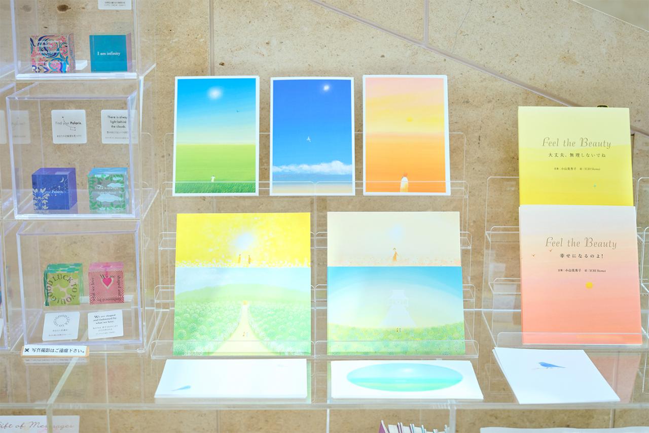 「MIHO MUSEUM」の建築や自然を表したものは、写真やイラストのポストカードにも。創業者とともに絵本を作った画家の葉祥明(よう しょうめい)はコーナーが設けられていて、美術館をテーマに描いた葉書のほか、数々の絵本や絵画が置かれている。