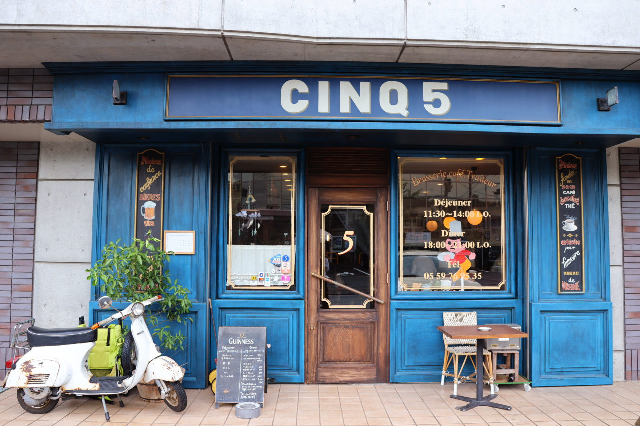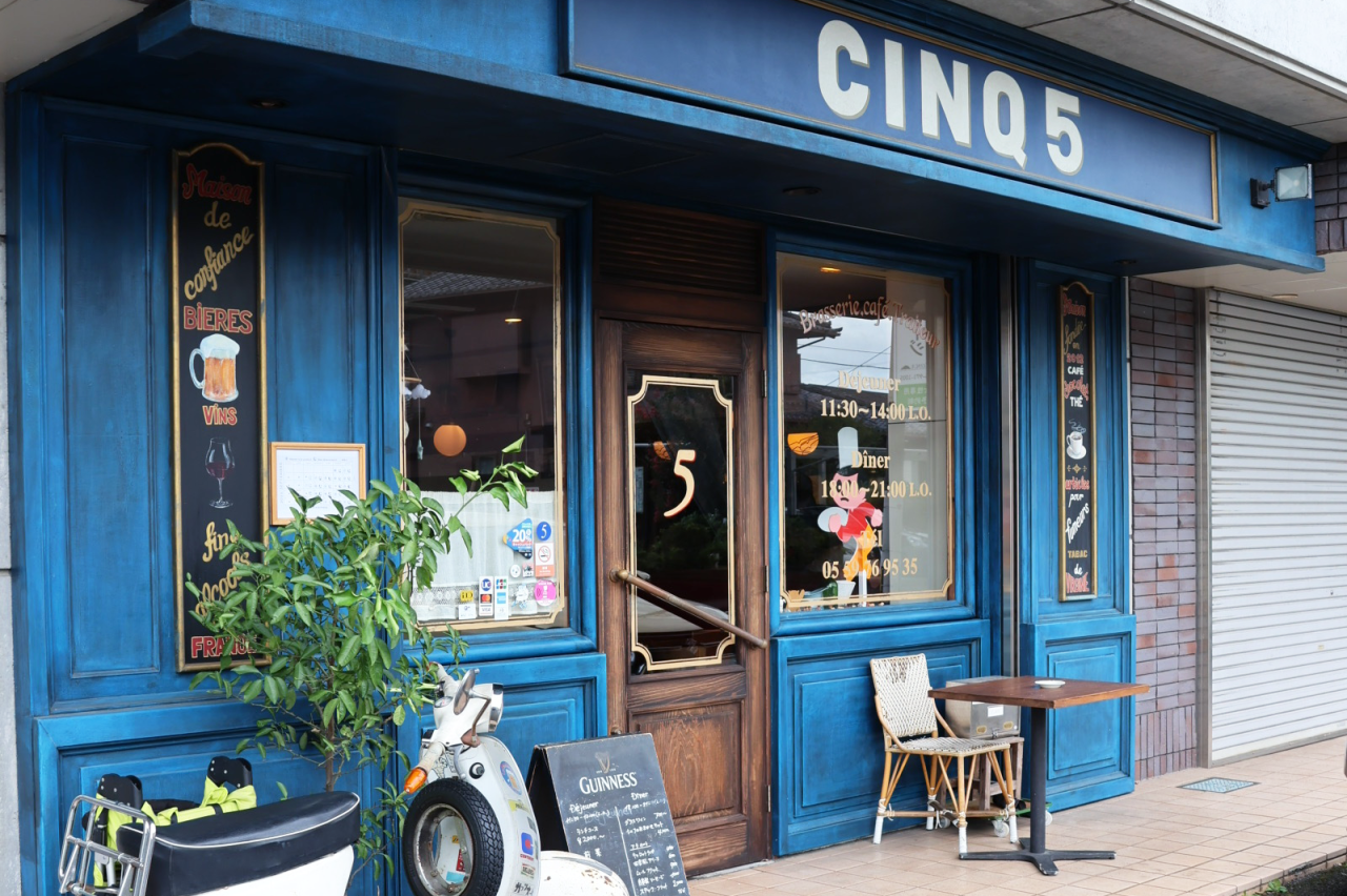 JR三島駅から歩いて約10分の場所に、パリのビストロを思わせる外観のフランス料理店「CINQ(サンク)」があります。 ご夫婦で営むこちらのお店は、濃いブルーが際立つかわいらしい外観。落ち着いた雰囲気の店内にはフランスのラジオが流れ、フランス料理=敷居が高いなんてイメージとは違い、かわいらしく穏やかな空気に溢れています。実際、フランスの方がふらりとやってきて「懐かしい」とおっしゃったそう。1人でも気軽に訪れることができるとても居心地のよい場所です。