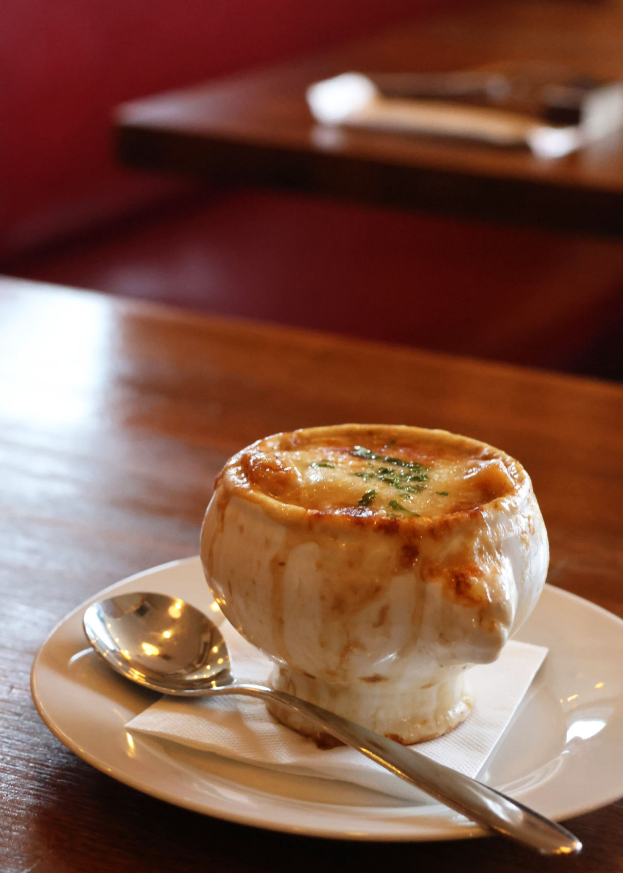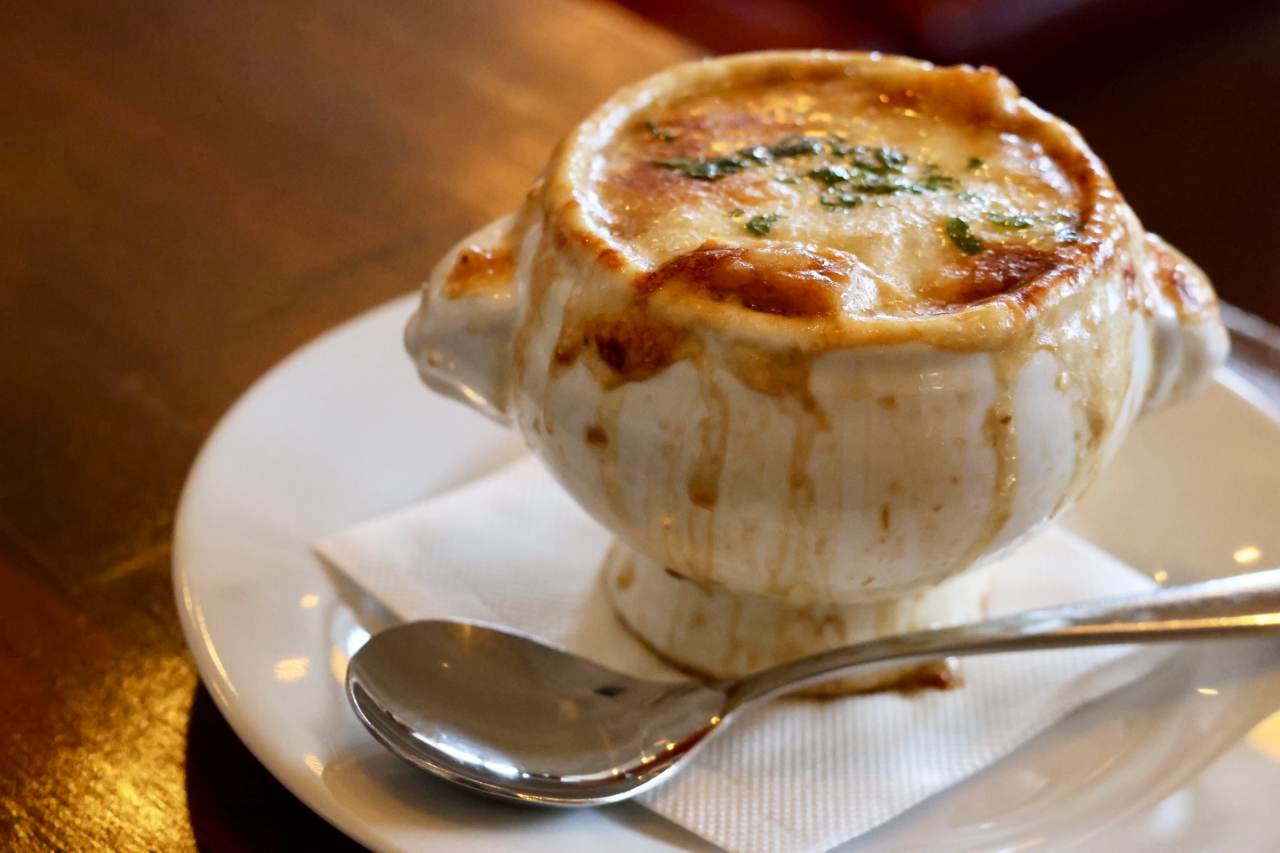 そして… 実は、ランチにはプラスで追加できるオニオングラタンスープがあるんです。これは絶対に頼んでほしい一品!トロトロの玉ねぎがたっぷり入っていて、スープにしみたバゲットと溶けたチーズの旨みが口の中にひろがります。食べたらホッと幸せな気持ちになるスープでした。