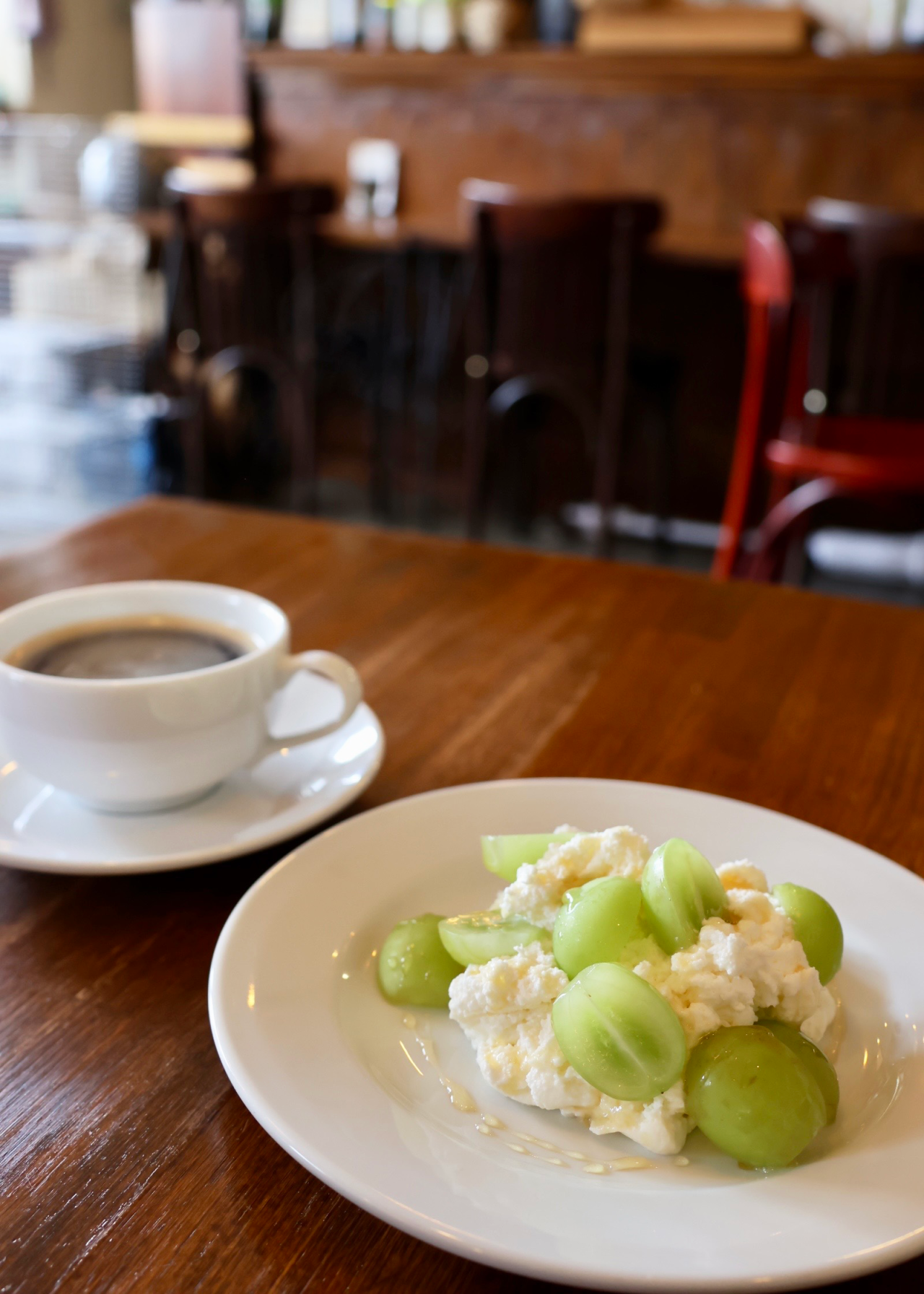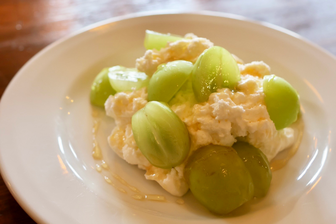 もちろんデザートも追加料金でオーダーできます。 5、6種類あるデザートの中から「クレメダンジュとシャインマスカット」をチョイス。柔らかくなめらかなレアチーズムースに、シャインマスカットがゴロゴロと入った見た目も味も贅沢なデザートでした。クレメダンジュのふわふわとした軽い食感にシャインマスカットの爽やかさが加わり、食後でもペロリと食べられます。