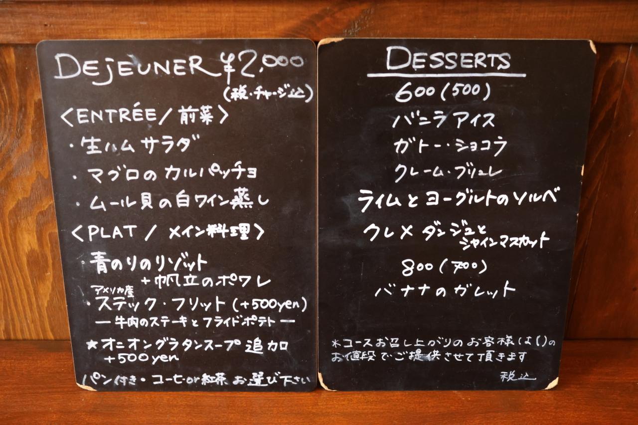 料金を見返してしまうほどリーズナブルなランチコース。前菜からメインまで一口目からその美味しさに感動し、一皿一皿丁寧に仕上げられたお料理はどれもお値段以上のクオリティ。こんなに本格的なフレンチが気軽に食べれるなんて…これは他のものも食べてみたい!と、壁に書かれたメニューに目をやると、またビックリ。ディナーコースもとってもリーズナブル!近くにあったら、毎日でも通いたくなるお店です。