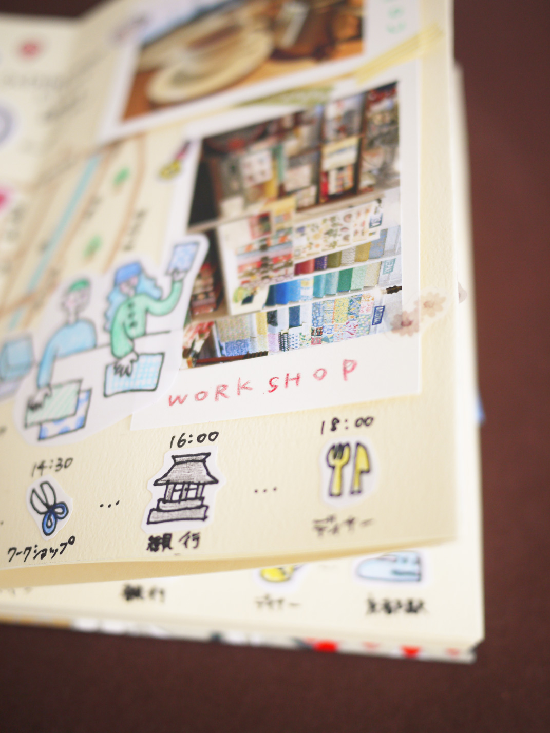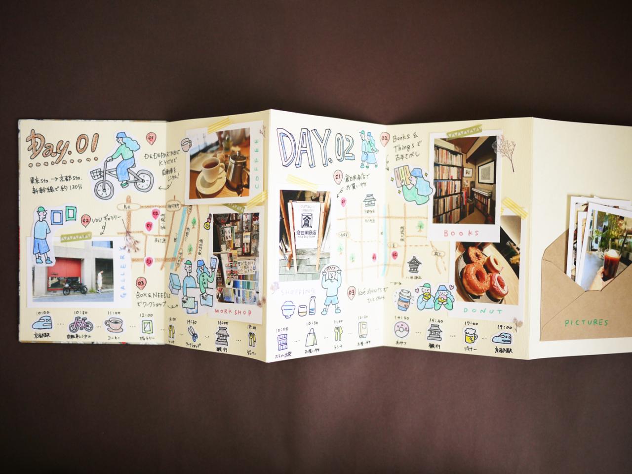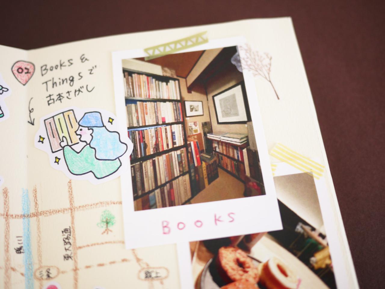 中面は、まずベースとなる地図などを手書きで描いてから、装飾するように写真や訪れたお店のチケットなどを配置するのがおすすめです。手書きのイラストも別の用紙に描いたものを切って貼り付けると、レイヤー感も出て、レイアウトの検討もしやすいかもしれません。紙面に動きが出るように、あえて重ねて貼り付けるのもおすすめ。
