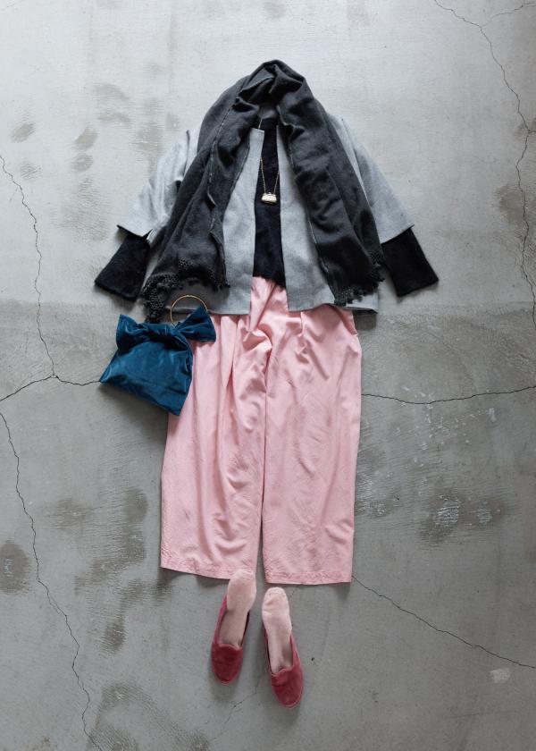 お気に入りのピンクをボトムスに取り入れて女子力を。ダークカラーのカシミアのニットとストールで、ほんのり丁寧で大人のセッティング。Q5. 旅の装いを選ぶとき、なにを一番意識しますか?