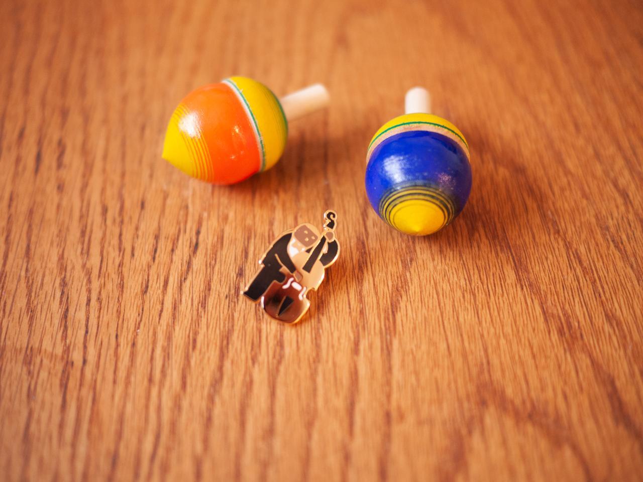 お店の中は様々なおもちゃや本で、目移りしてしまったのですが、今回は少し懐かしい気持ちになる品々を選んでみました。まずは、帽子を被ったどんぐりのような形がかわいい、木製のどんぐりごまを2色。シンプルであるが故の美しさを持つ一品です。