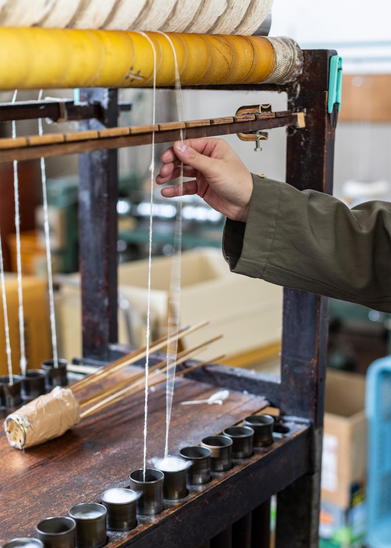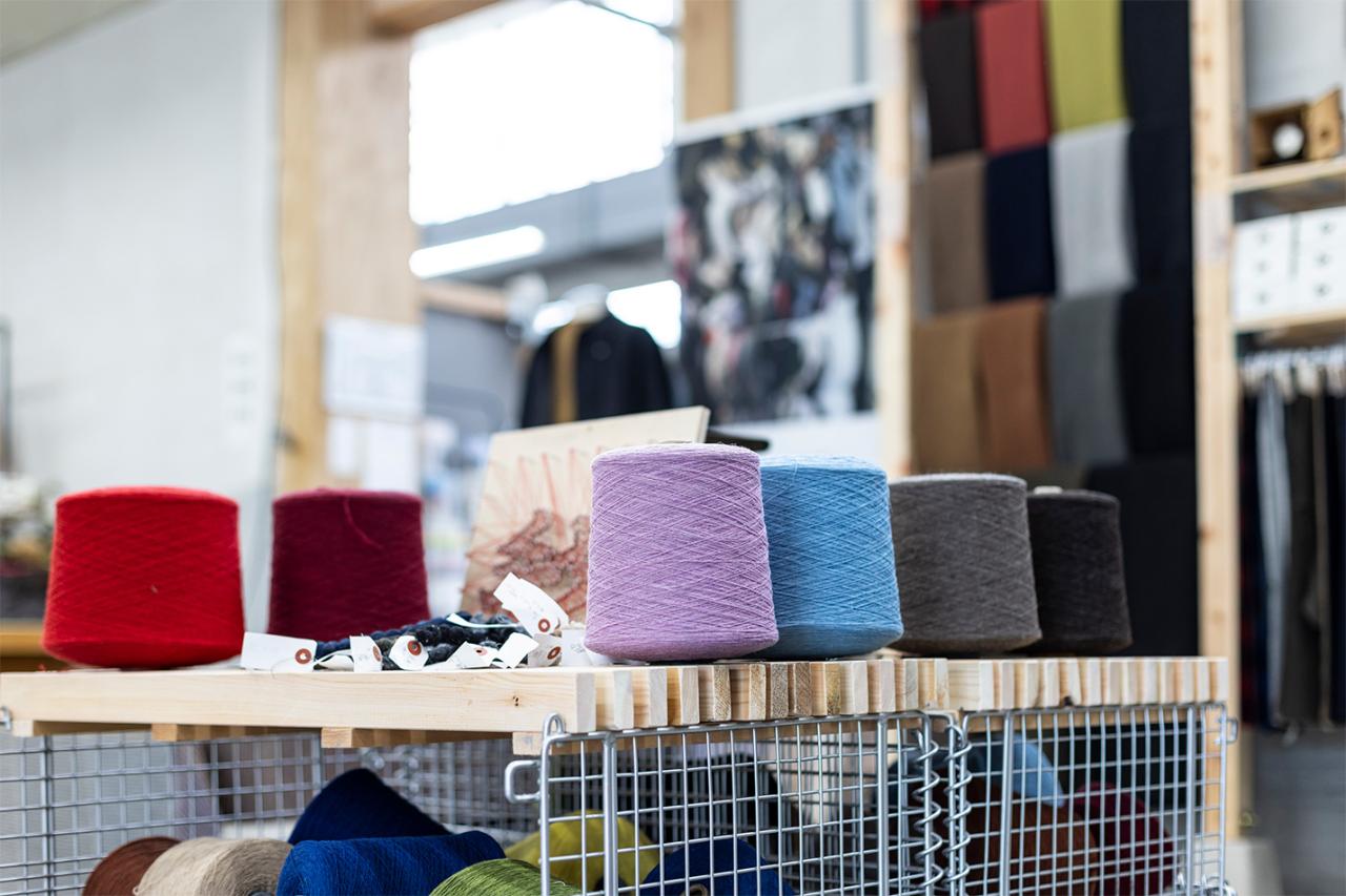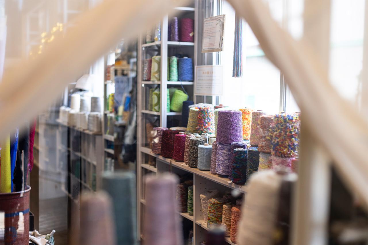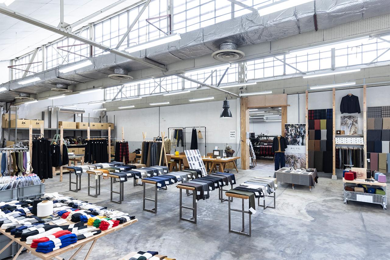 そんな中、地域でその名を知らない人はいないほどの名門工場で、広大な敷地を誇る木玉毛織は、事業縮小によって工場内で使われなくなったスペースを同じ繊維産業を支えるさまざまな作り手に提供。そして〈新見本工場〉がオープンしたことにより、いつしか敷地内で糸を紡ぐところから、生地の織り、服のデザイン、仕立て、販売までがすべて担える“木玉ビレッジ”が形成された。