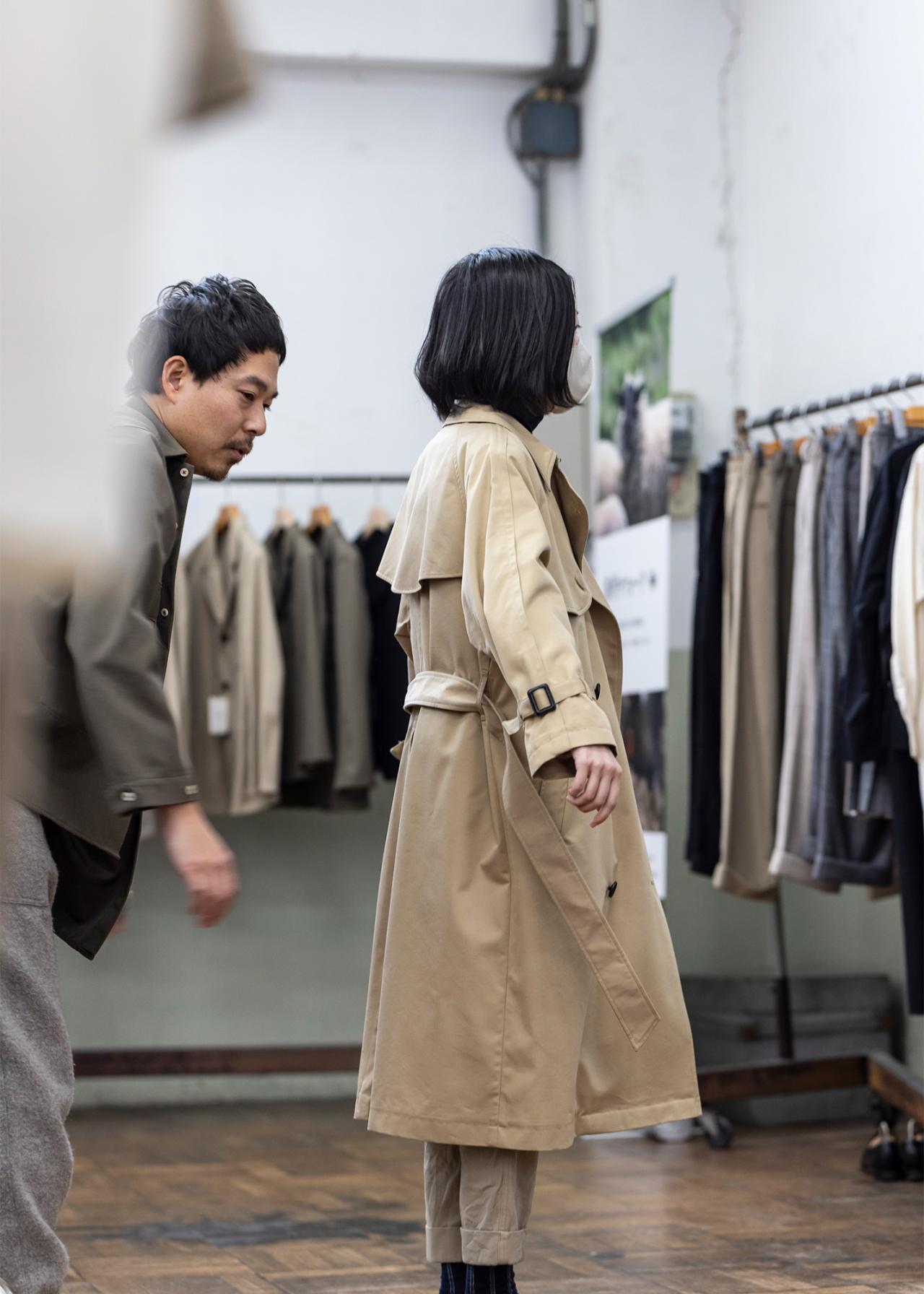 トレンチコートのために新たに開発された、コットンとウールを組み合わせたオリジナルの生地は、上品な光沢としなやかなドレープがあまりにも美しく、鏡に映った自分の後ろ姿に思わずうっとりしてしまう。