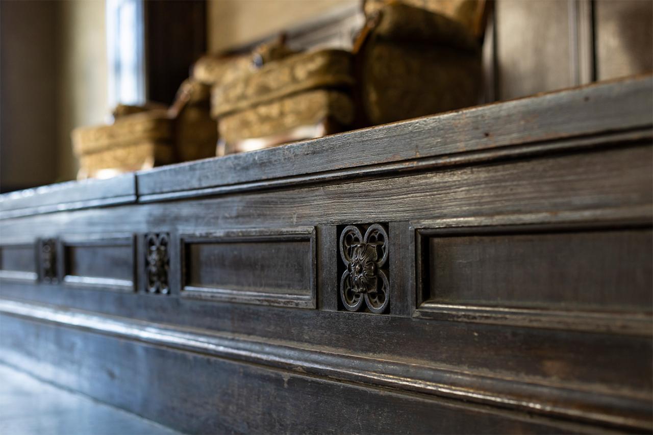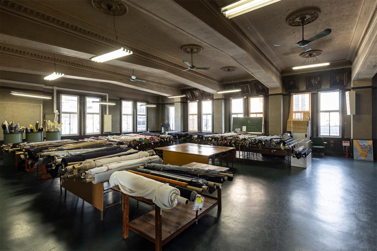 3階にある立派な大ホール(旧会議場)も、同じく生地のストックヤードとして活用されている。ここは館内でも特に往時の面影が色濃く残る空間だ。歴代組合長の肖像画、調度品や舞台に施された繊細な意匠…。どこも見応えがあり、つい時が経つのを忘れてしまう。