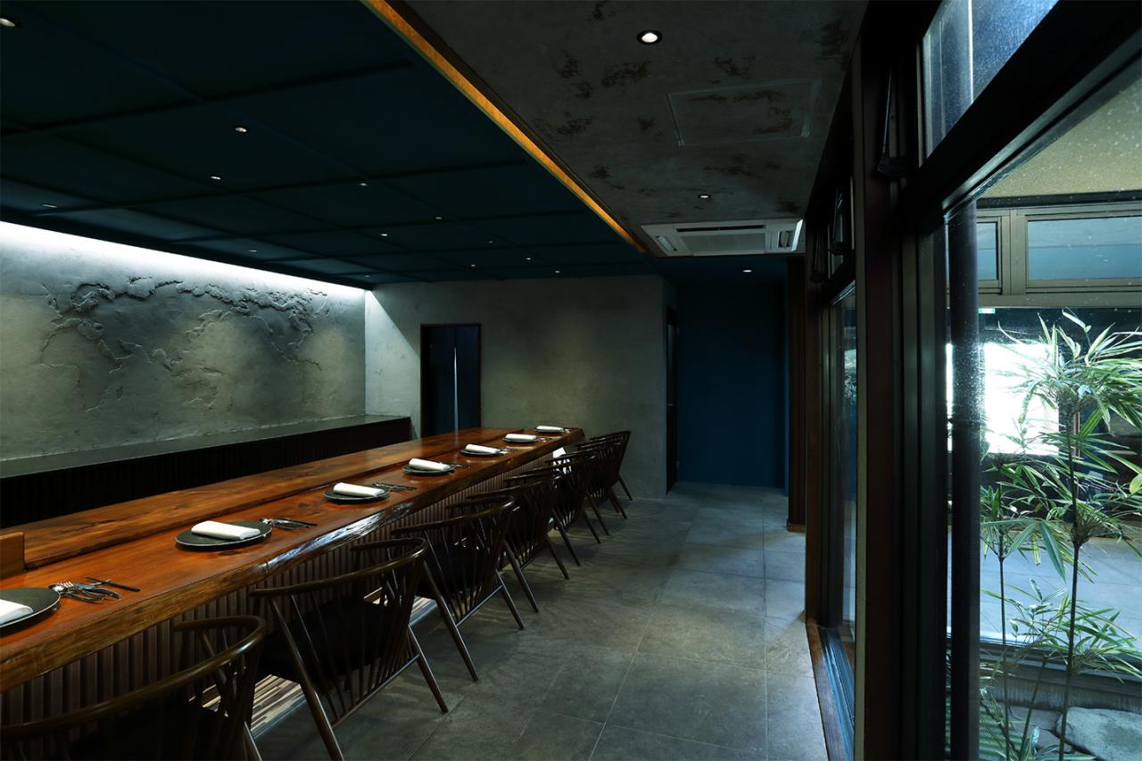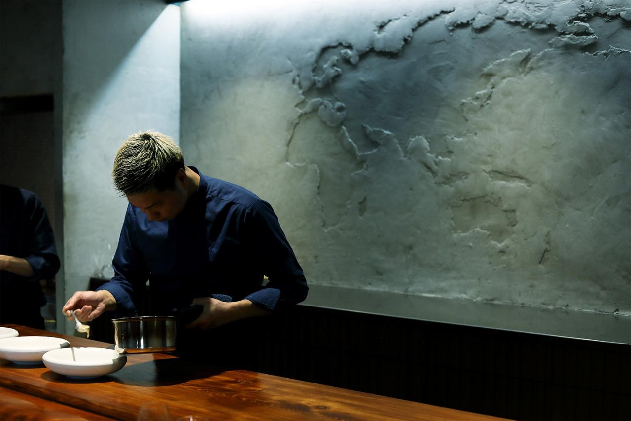 カウンター全8席で、昼・夜の二回転制。料理はお任せコースのみで一人12,000円(税別)。5杯と8杯のワインペアリングもおすすめ。毎月一日、電話または専用サイト(OMAKASE)で二ヶ月先の予約を受け付けている。