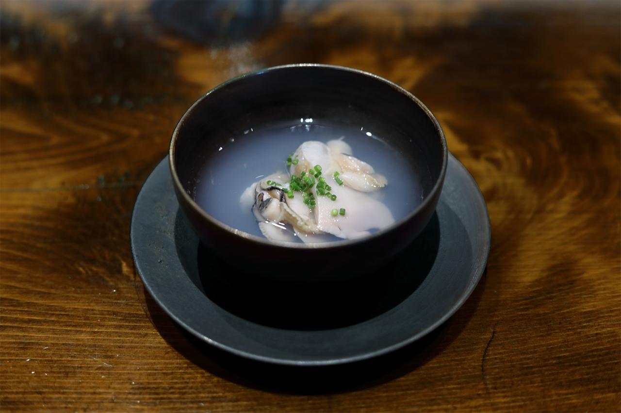 蛤のエキスと水のみで調理した“蛤のスープ仕立て”でスタート。蛤は殻付きで200gくらいとかなり大きい。「お椀のように直接口をつけてお召し上がりください」。しみわたる旨みに期待が高まる。