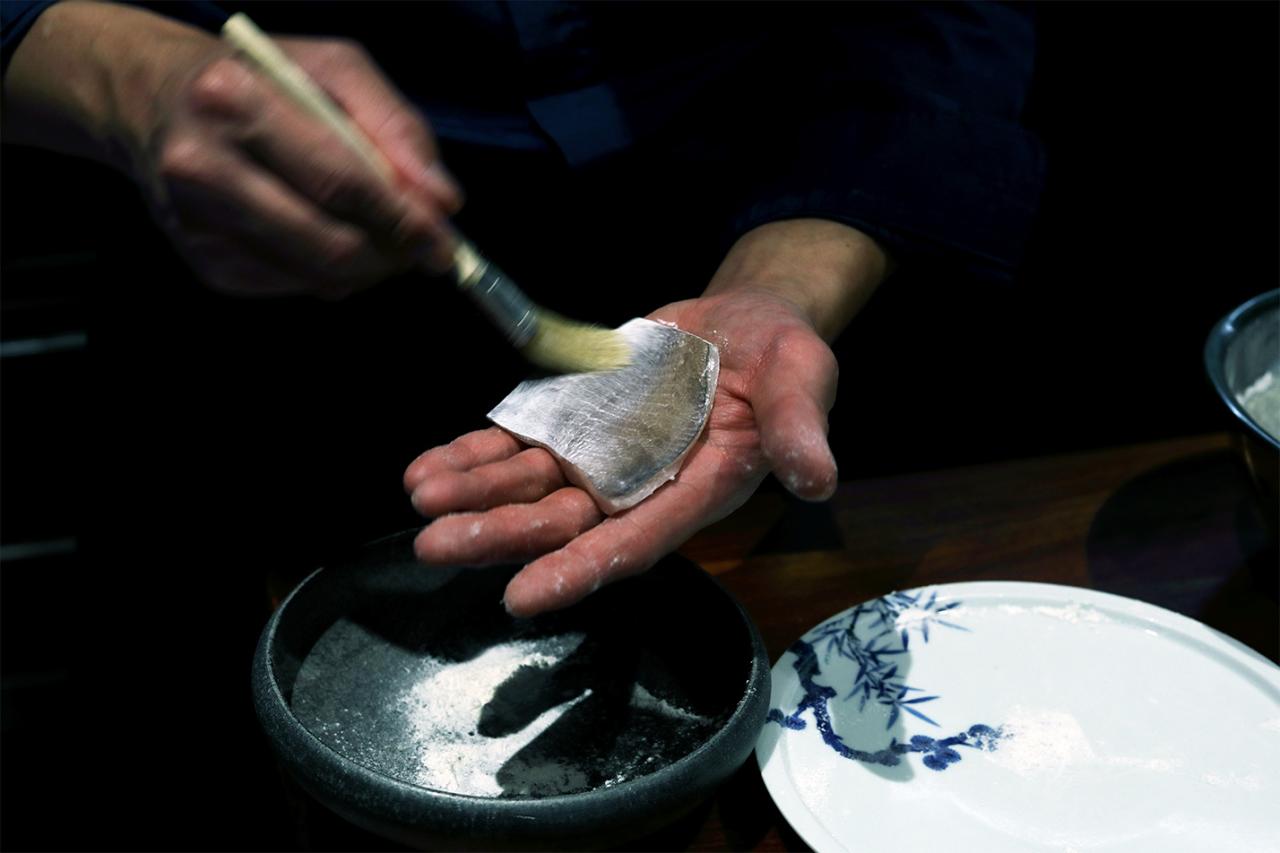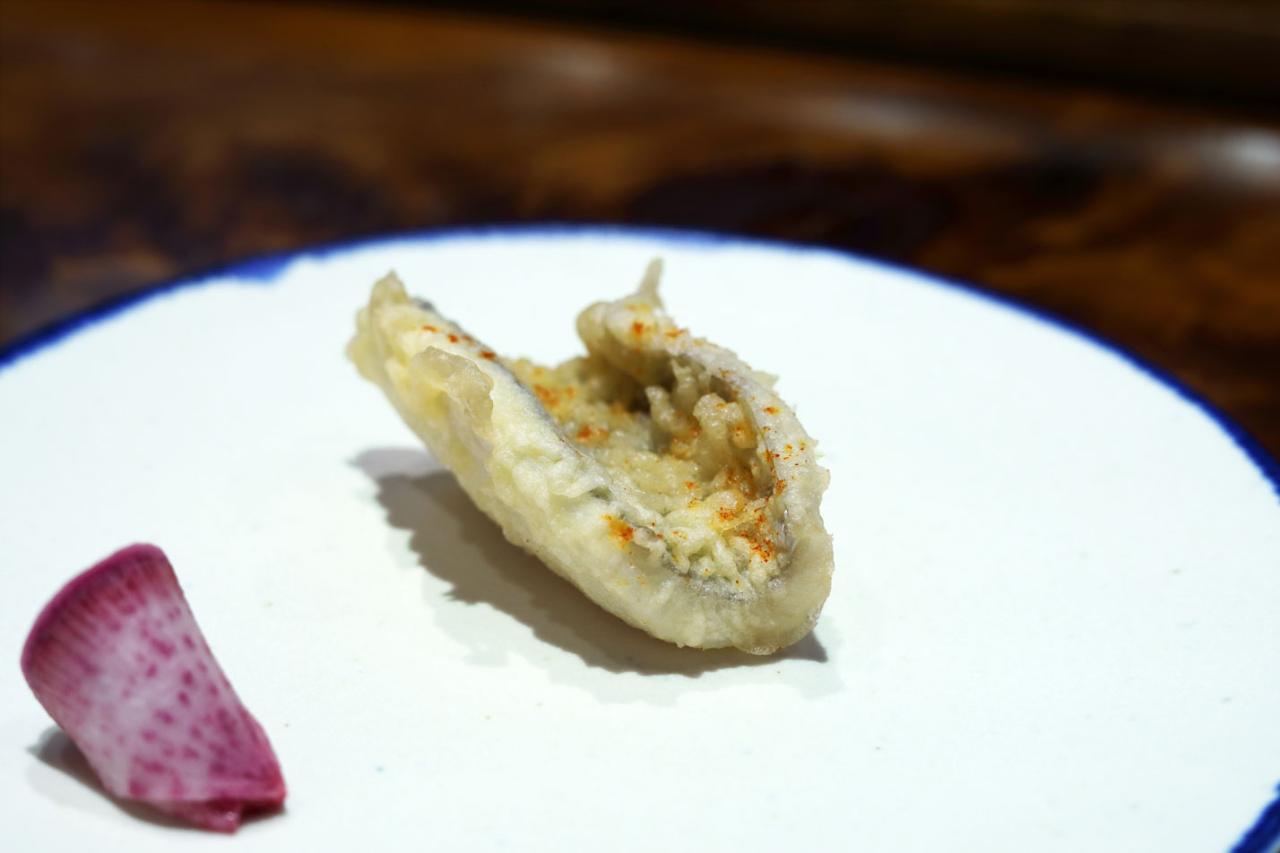天ぷらのように揚げたての熱々が供される“えぼ鯛のフリット”。口当たりはふわふわ、噛めばしっとり、ふっくら! 「前田さんの仕立ては保水性があるので、熱を加えるとその水分が膨らんで食べたときすごくジューシーなんです」。このえぼ鯛や鯵、鰆といった地魚は、小川港の定置網漁で獲れたもの。「すくったあとも元気に泳いでいる魚だけを選んで、港に持ち帰る。水槽に移して泳がせ、生きてる状態のものを前田さんが締めるというやり方です」。