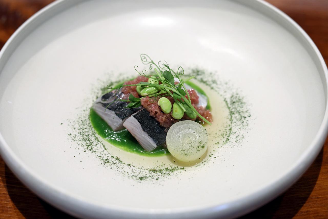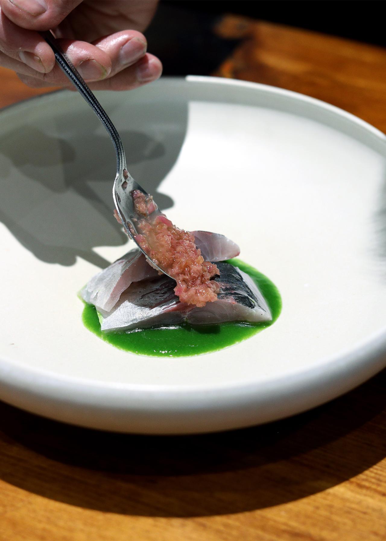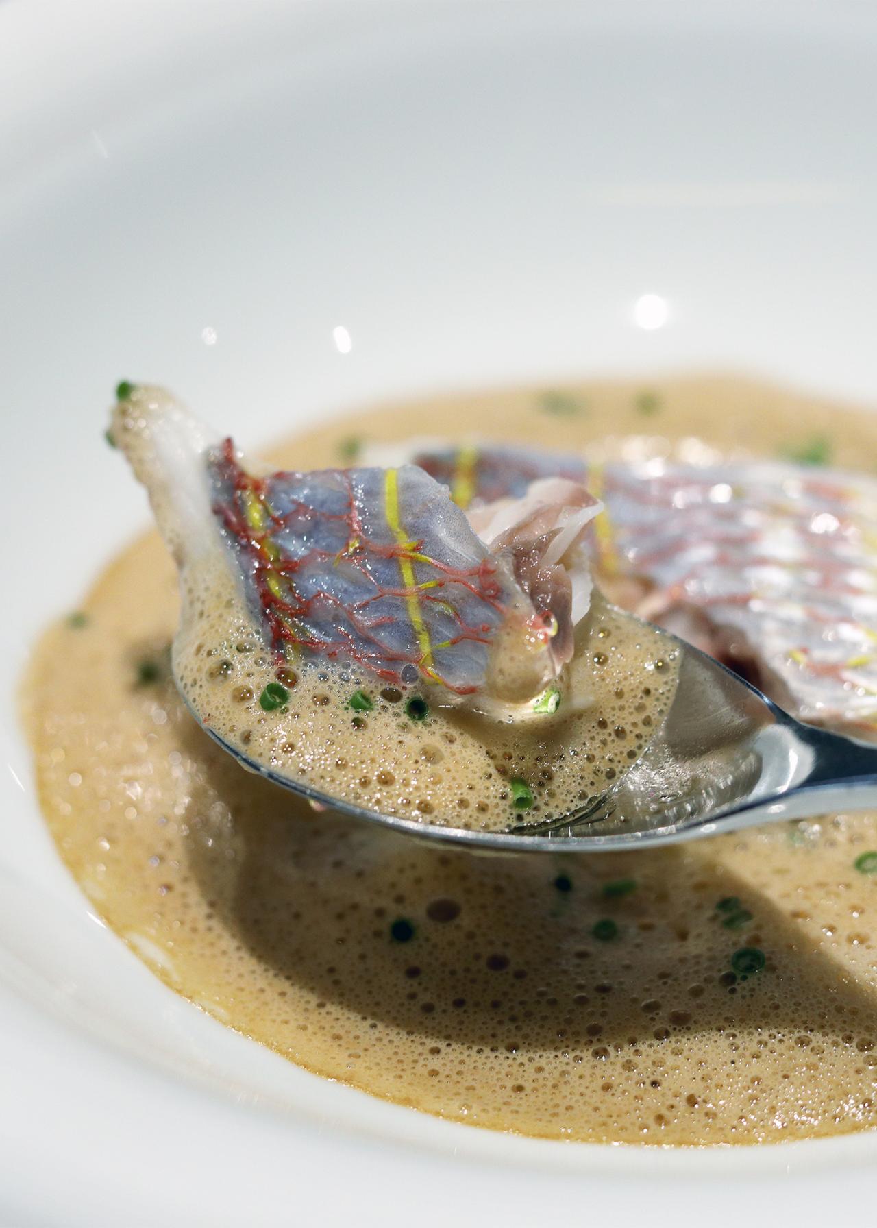水揚げされたばかりの鯵は食感を楽しめるように大きめにカットし、レッドオニオンソースと菜の花のピュレで。「“獲れたてでありながら旨味を引き出す”仕立てというのが、やっぱり難しい。前田さんの魚はそれがあるんです」。春の鯵は、脂がのって味が濃い。「さらに駿河湾の鯵は、春や秋に桜海老を食べているんですよ。これはやはり、ここならでは。栄養価も旨みも高くなります」
