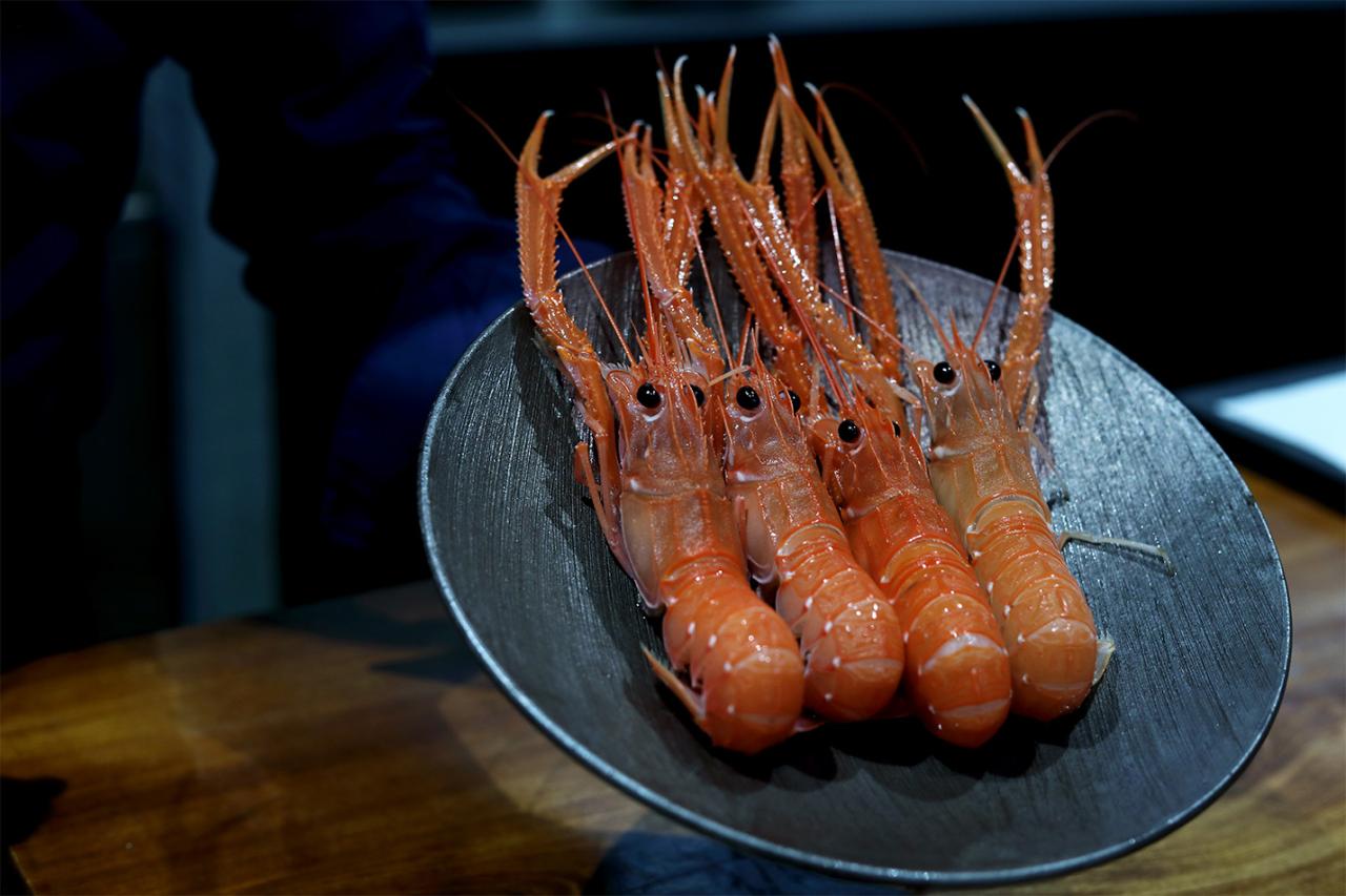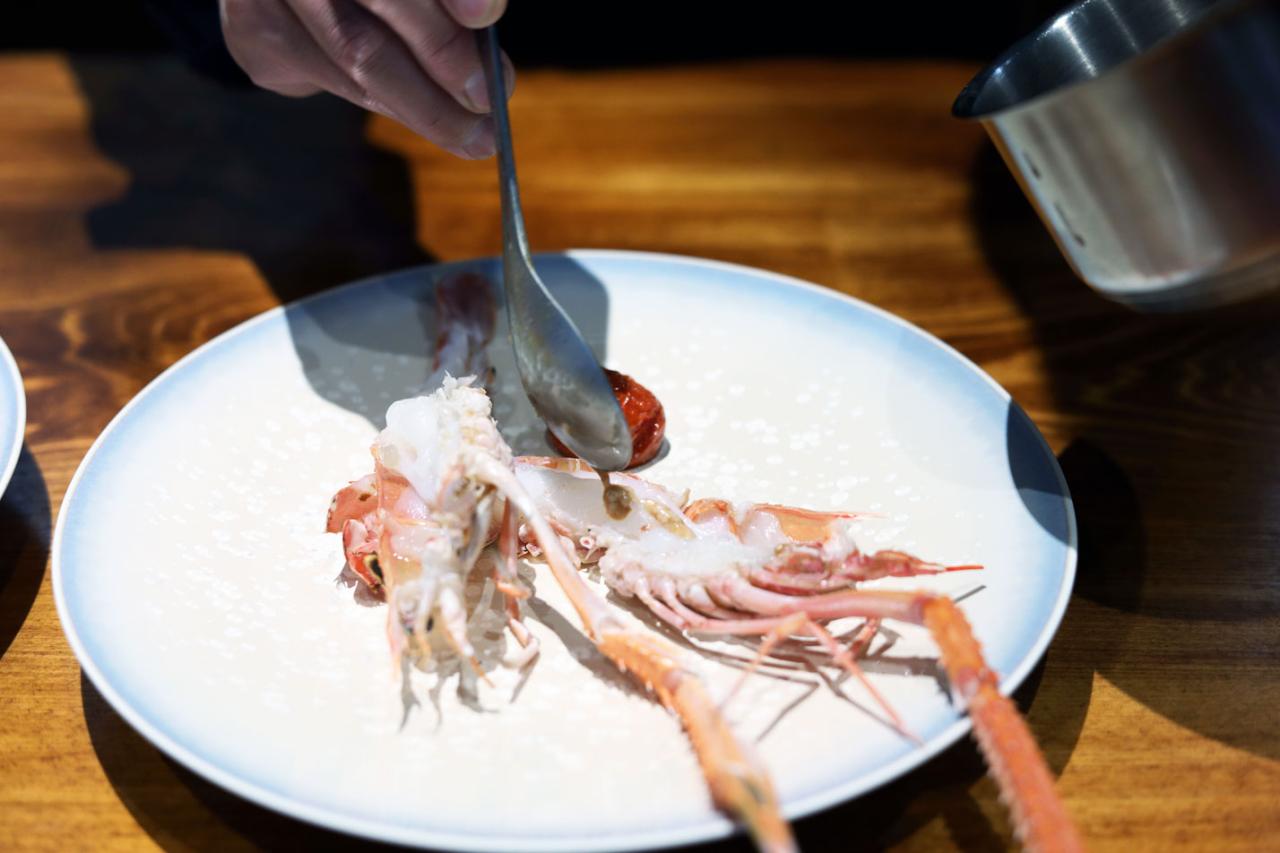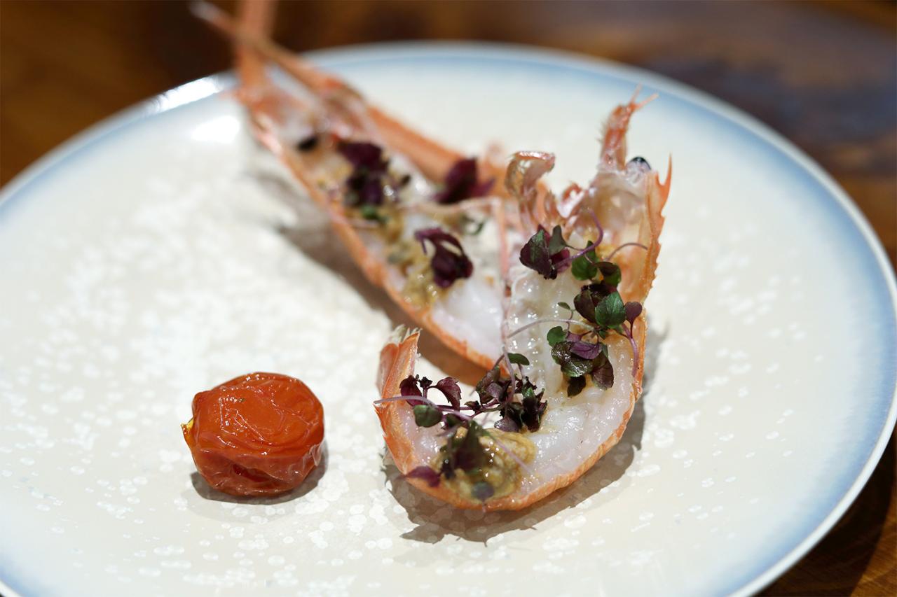 生きた状態のアカザエビには、感謝を伝えつつ。「焼津のエビは籠漁(かごりょう)なんで、ガサッと水揚げしない。だから状態がいいものが多いんです」。お塩すらせずサッと炭火でレアに仕上げたら、エビ味噌のソースと、長時間オーブンで焼いてセミドライにした静岡県産の甘いトマトを添えて。