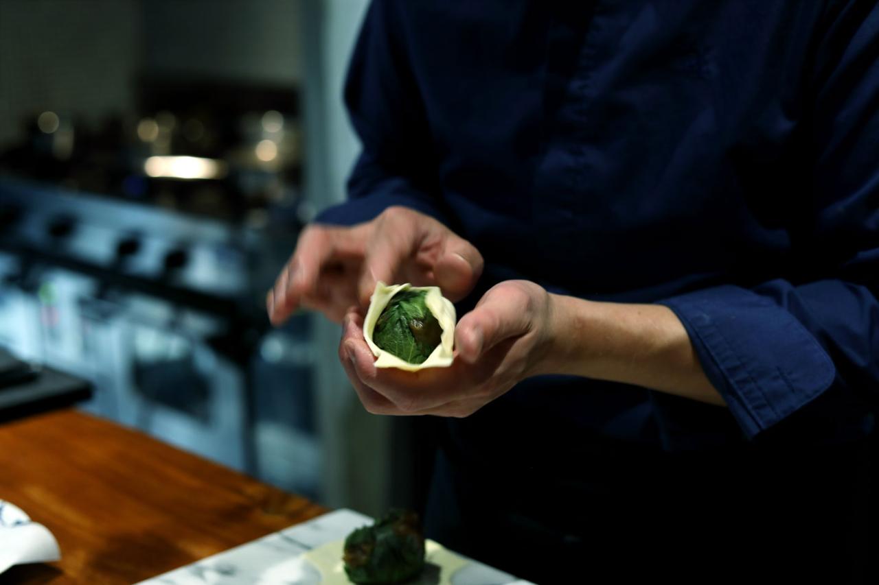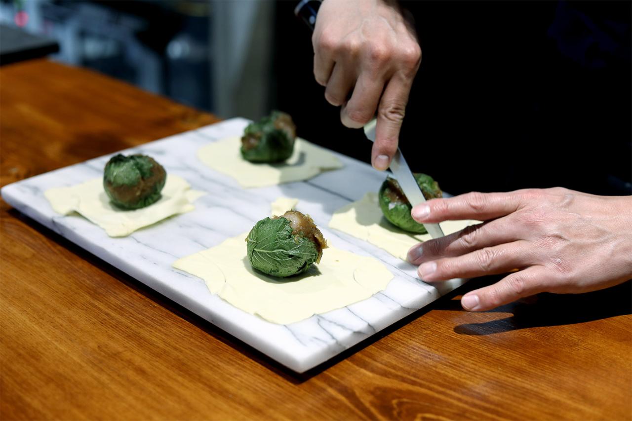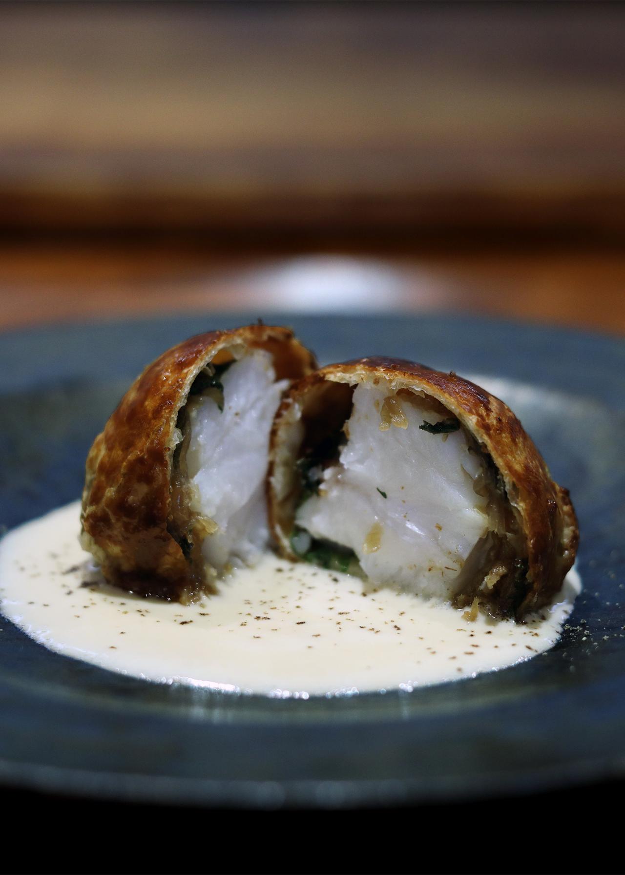 看板メニューの“魚のパイ包み焼き”は、最後の工程をカウンターで見せてくれる。「せっかくお客様との距離が近いので、直接見ていただけたらと思って」。魚の火入れをベストにするため、パイ生地は透けるくらい薄い。繊細でスピーディな手元の動きに目を奪われる。