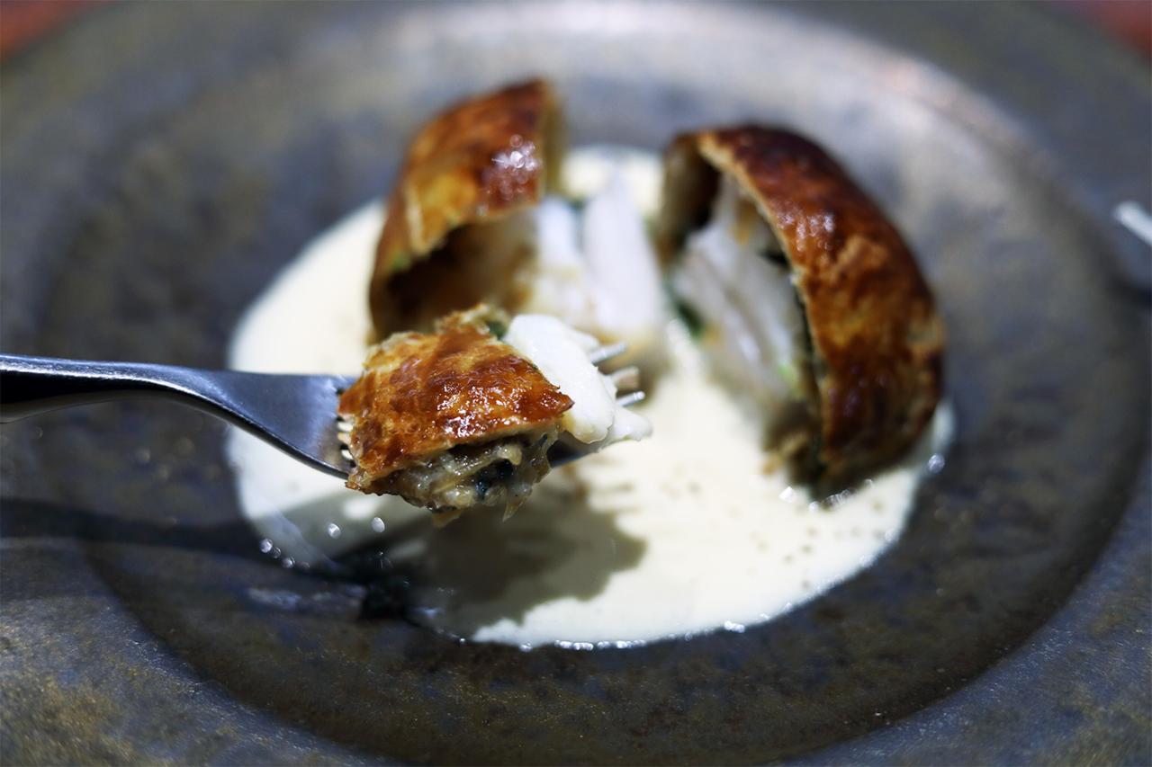 いよいよ、スペシャリテのパイ包み焼きの登場。本日のお魚は新鮮な太刀魚!「玉ねぎをじっくりと炒めたものを合わせて、大葉でくるんでいます」。まさに外はサクサク、中はふっくら。クリームを使った濃厚なヴァンブランソースがよく絡みつつ、爽やかな風味が広がる。