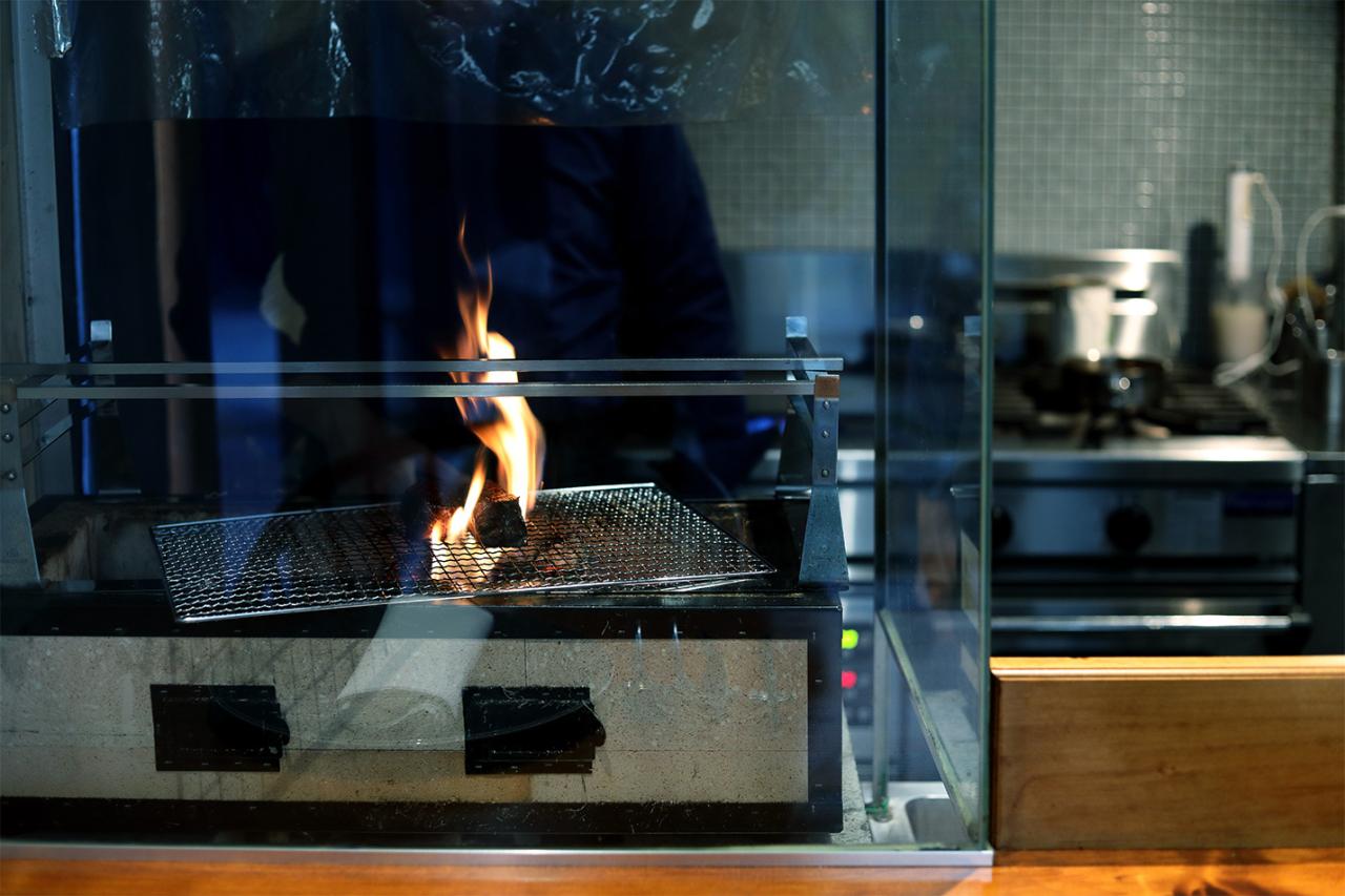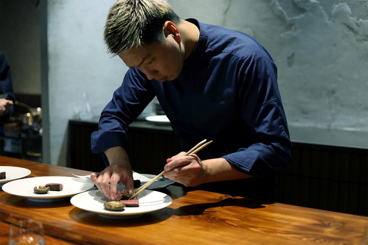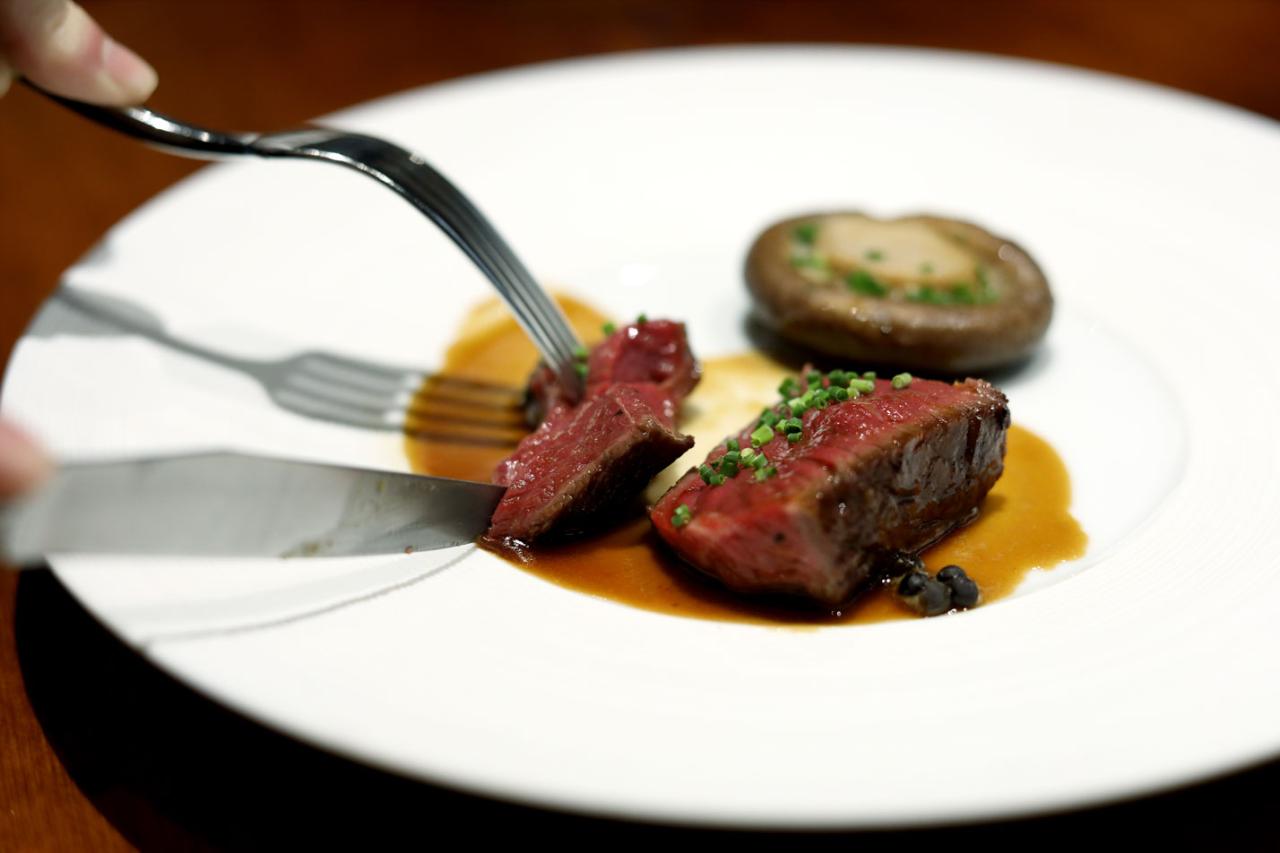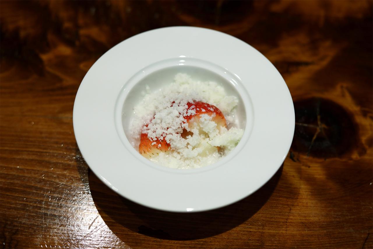 メインディッシュ、最後の一皿は山口県岩国産の高森和牛の炭火焼き。静岡産の肉厚な椎茸・玉取茸(たまどりだけ)のムニエル風、生胡椒と一緒にいただく。みずみずしくてシャキッと甘く、とてもきれいな味のお肉は、ミートスペシャリストとして知られる肉職人、沼本憲明さんの手によるもの。肉の旨みを最大限に引き出すと言う独自のカット技術は、世界的にも“沼本カット”と呼ばれてるそう。