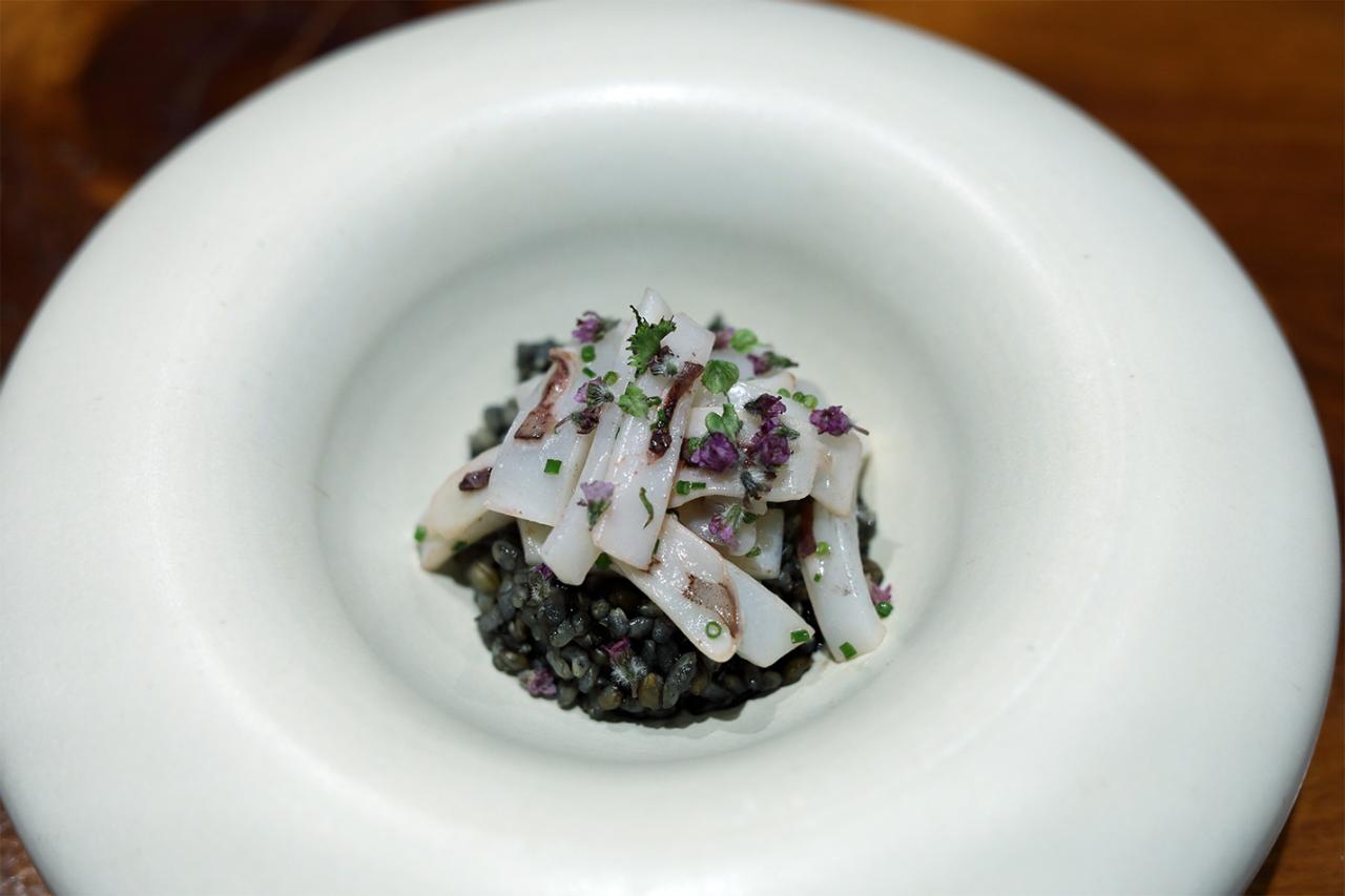 軽くソテーしたアカイカをたっぷりとのせたイカ墨リゾットで、お食事の締めを。噛みごたえのある玄米とプチプチとしたもち麦、弾力のあるイカ。旨味とともにいろいろな食感が楽しめるのが嬉しい。