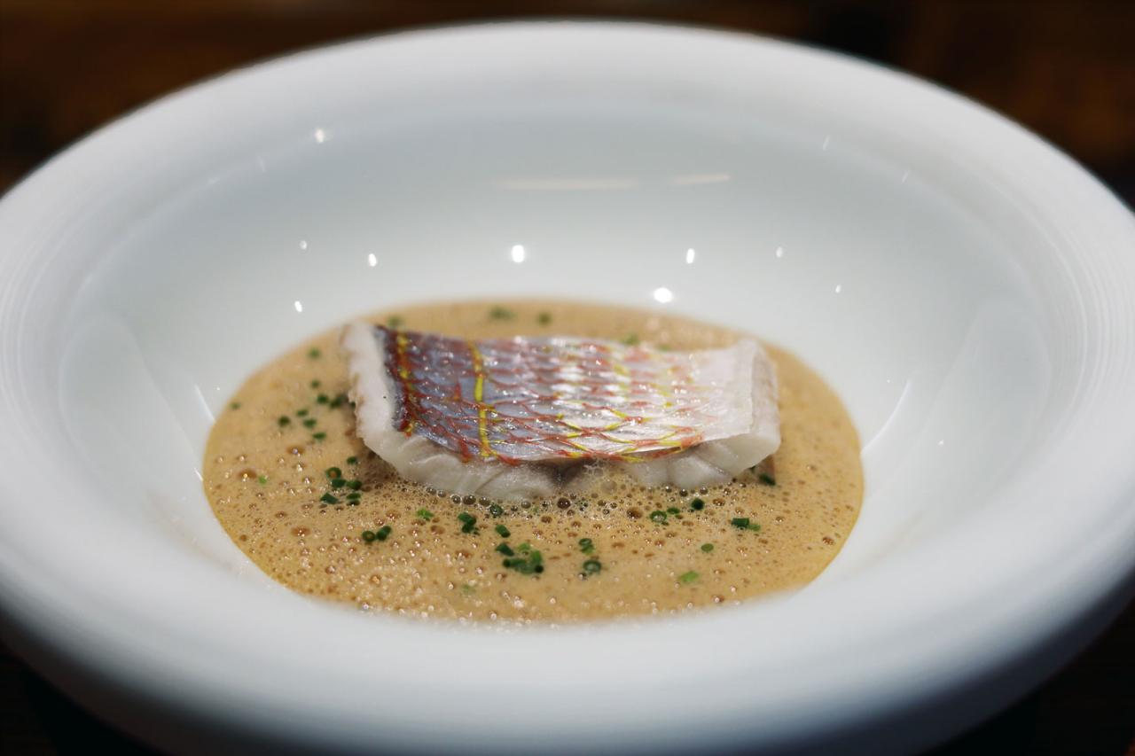 低温でじっくり火を通した美しいイトヨリ鯛は焼津港から。「ジャガイモのピュレとふわふわに泡立てた甲殻類のソースで軽く仕立てました」。焼きたてのパンにはボルディエの海藻バター付き。スープボウルで出してほしいくらいに味わい深いピュレとソースを、パンでこそげて最後まで。
