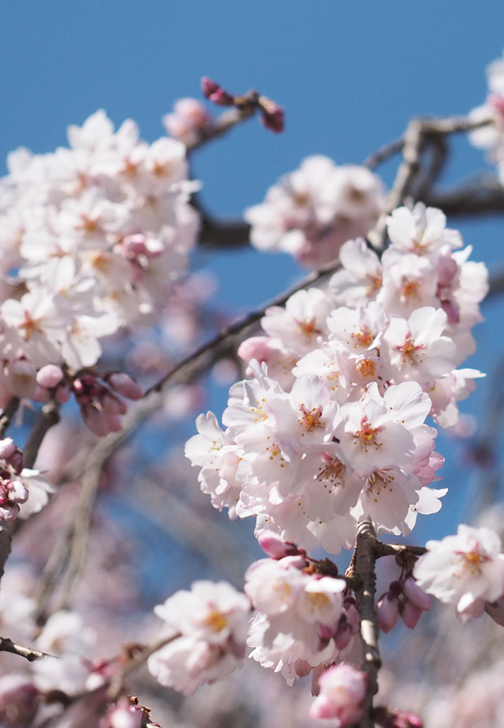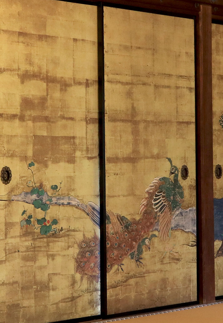 桜の華やかさとはまた違う、荘厳な美しさを感じられる。時間を忘れて眺めていたくなる庭だ。もうひとつ心を動かされたのが室内に咲く桜。平成に浜田泰介画伯によって描かれた襖絵で、月の光を受けて花びらが舞う姿に風情を感じる。桜を堪能したあとだからこそ、繊細な筆致にいっそう感じ入るものがあるのかもしれない。