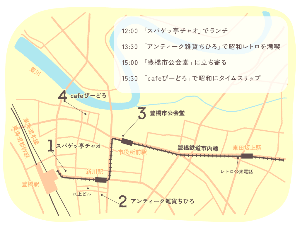 いつもと違う愛知県観光には、豊橋市の〈スパゲッ亭チャオ 本店〉〈アンティーク雑貨ちひろ〉〈豊橋市公会堂〉〈cafeびーどろ〉がおすすめ。