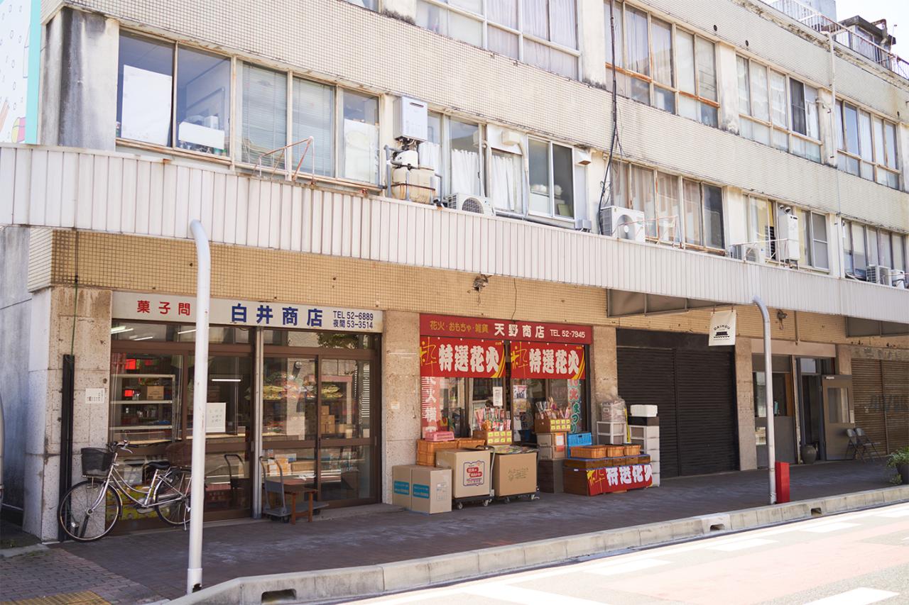 お腹を満たしたあとは、さっそく豊橋鉄道市内線に乗って新川駅へ。豊橋のレトロの象徴ともいえる商店街「水上ビル」へと向かう。水上ビルは1964年に水路の上に建設された珍しい建物だ。東西に800メートルほど続く建物は2階より上が住居、1階部分の多くが商店になっている。「豊橋ビル」「大豊ビル」「大手ビル」の3つの建物で構成された水上ビルには、レトロな老舗喫茶や、おしゃれなスイーツ屋さんなど、新旧さまざまなお店が並んでいる。特に目に留まったのは、お菓子や花火、おもちゃなどの問屋さん。駄菓子や、昔ながらのおもちゃが所狭しと並べられていて、レトロ感満載である。