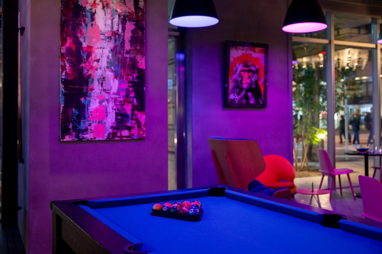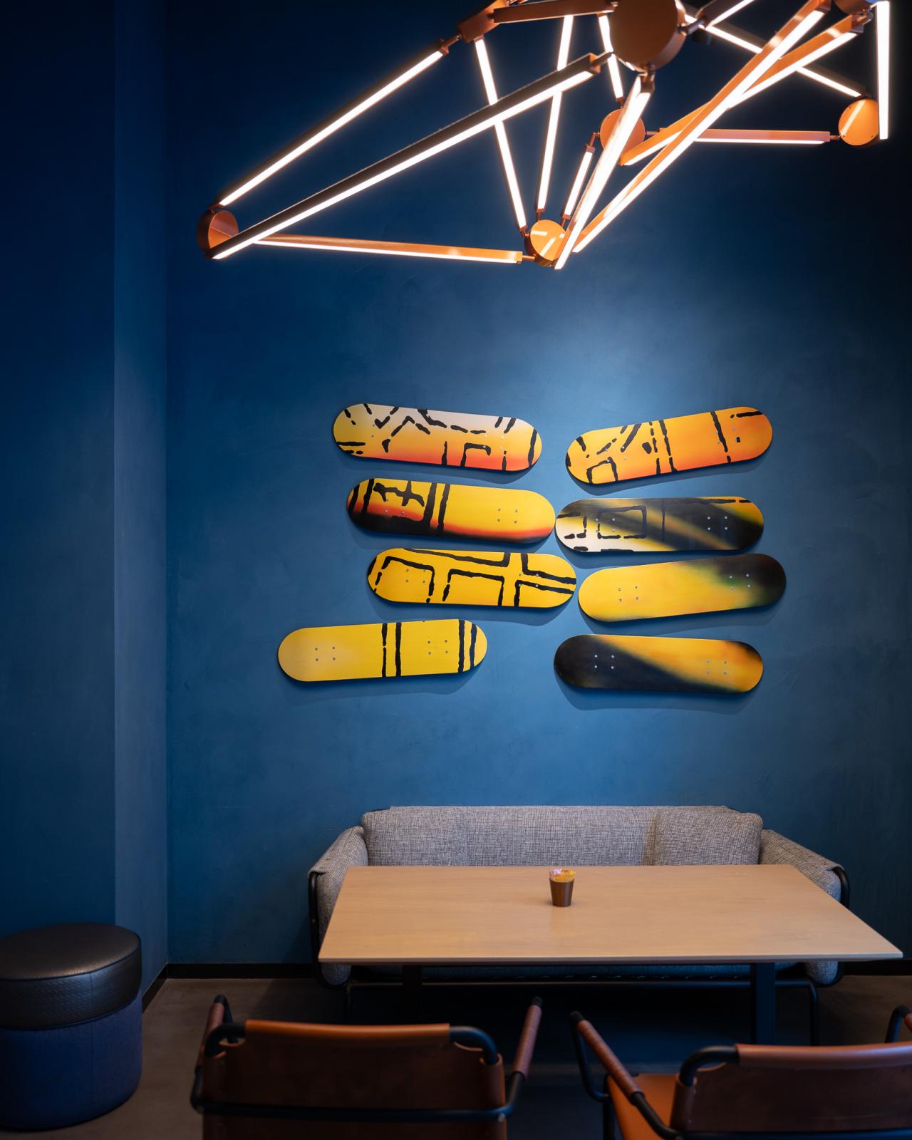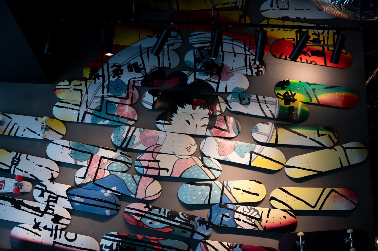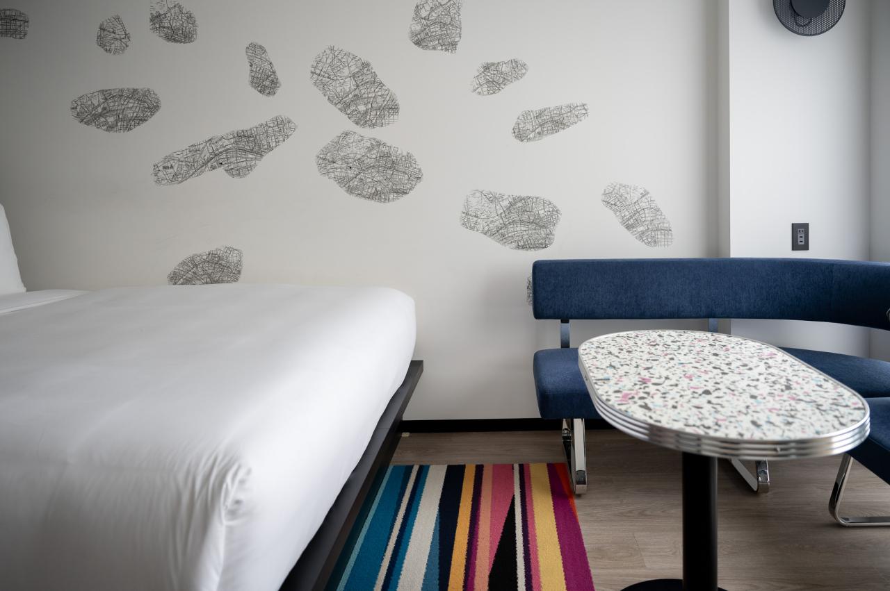 アロフト大阪堂島は、一歩踏み込むとたくさんのアートでむかえてくれます。スケボーのウォールアートはこのホテルらしく、ポップと和が上手く合わさっていて、目をひきます。