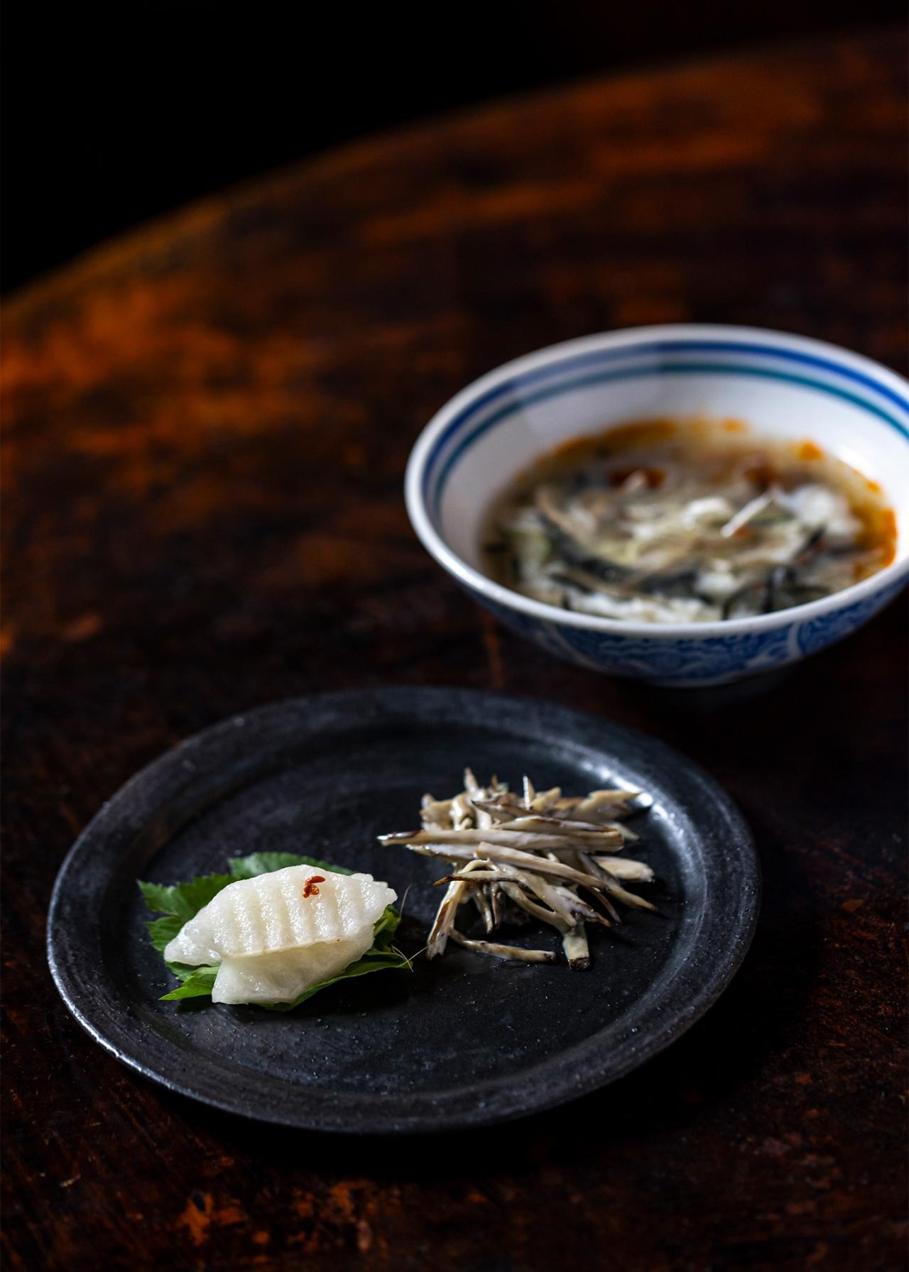 訪れた日のランチコースの前菜は、金木犀のシロップでマリネした梨とモロヘイヤの葉に、自家製マヨネーズで和えたごぼう。スープの酸辣湯(スンラータン)には、愛知県の篠島(しのじま)で採れたひじきや、鶏、香辛野菜がたっぷり入っている。その複雑な香りに、食感に、味わいに、とにかくこの料理を余すことなく堪能したいと本能が働くのだろう、自分の五感がみるみる研ぎ澄まされていくのがわかる。