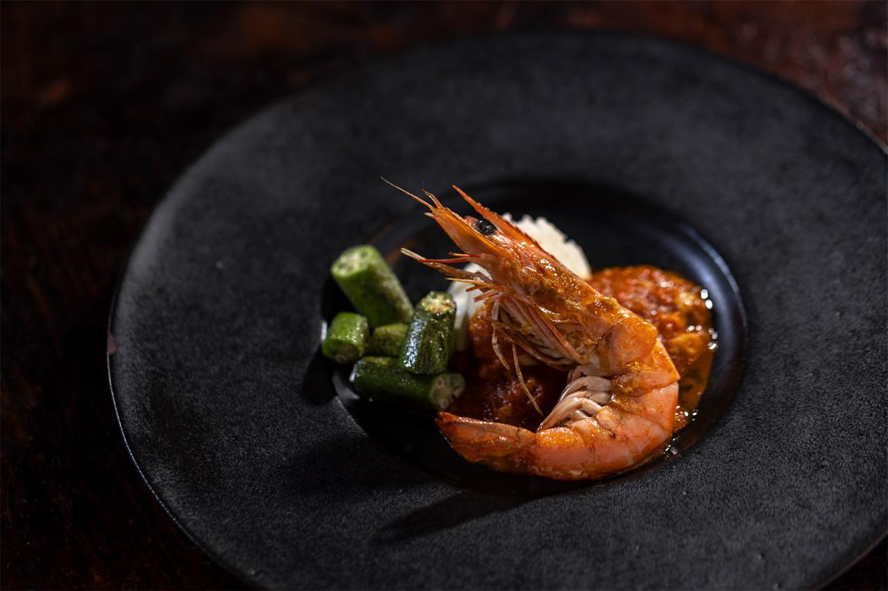 メイン料理は、ニューカレドニアで天然に近い状態で育てられた「天使の海老」を使ったエビチリをセレクト。ソースは舌を刺激するような辛みではなく、軽やかで楽しい辛さ。海老を頭から尻尾まで、ソースもパンで残さずすくってと、すべてを余すことなく味わい尽くしたくなる贅沢な一皿だ。