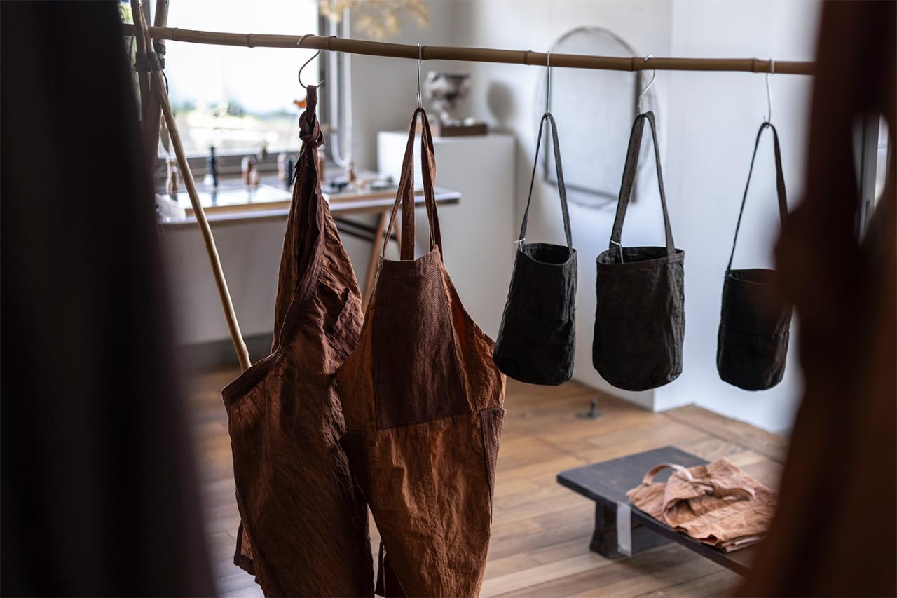 生地は今では希少となったシャトル織機で織られた国産の布を中心に、インドの手紡ぎ手織りのカディコットンなどを使用。それを藍染や草木染め、柿渋染めと、いろんな技法を駆使しながら、自分たちの手を使って染める。