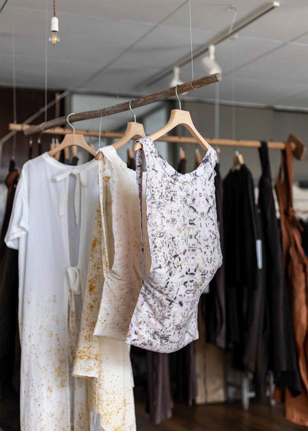 服のデザイン、パターン、作図はさやかさんが自ら手掛け、断裁や縫製は地域の縫い子さんと協力しながら、染めは亮平さんが中心となって一緒にと、すべて“小さな循環”の中で服作りをしている。